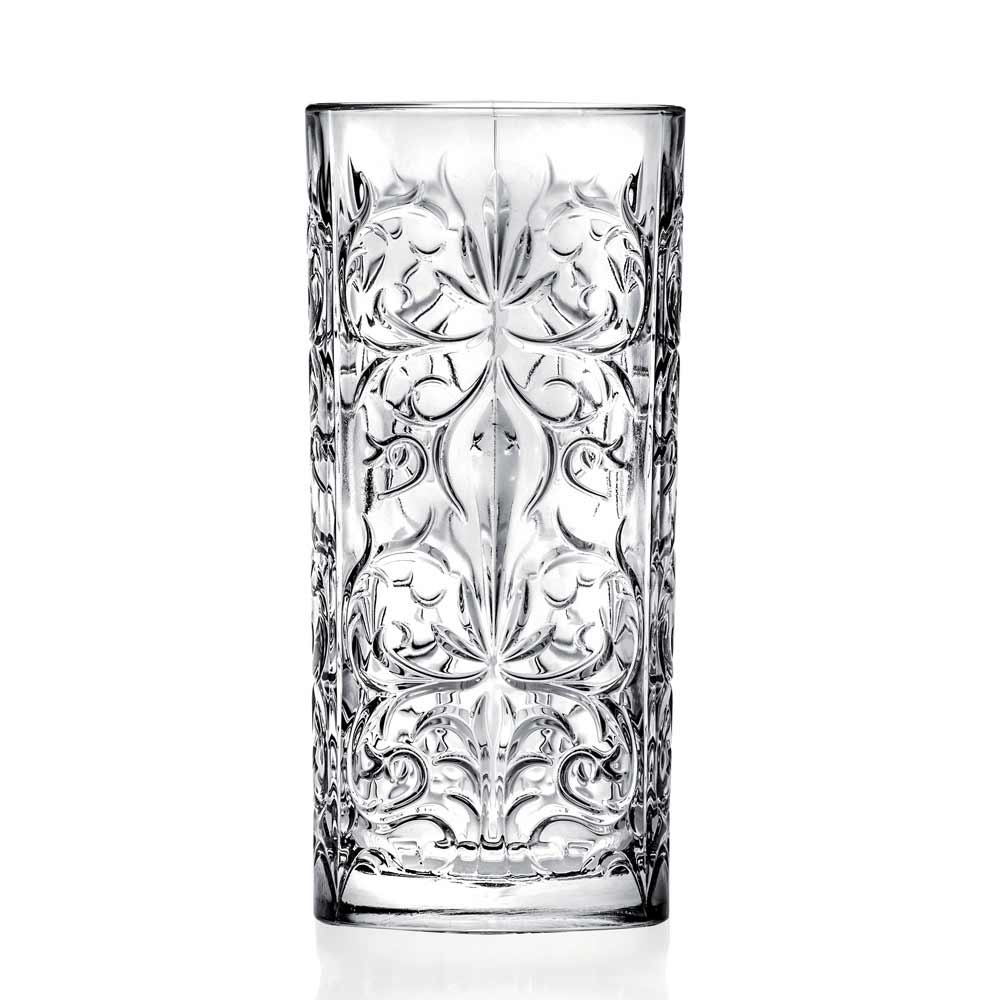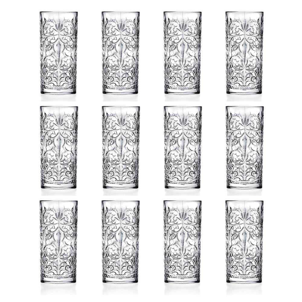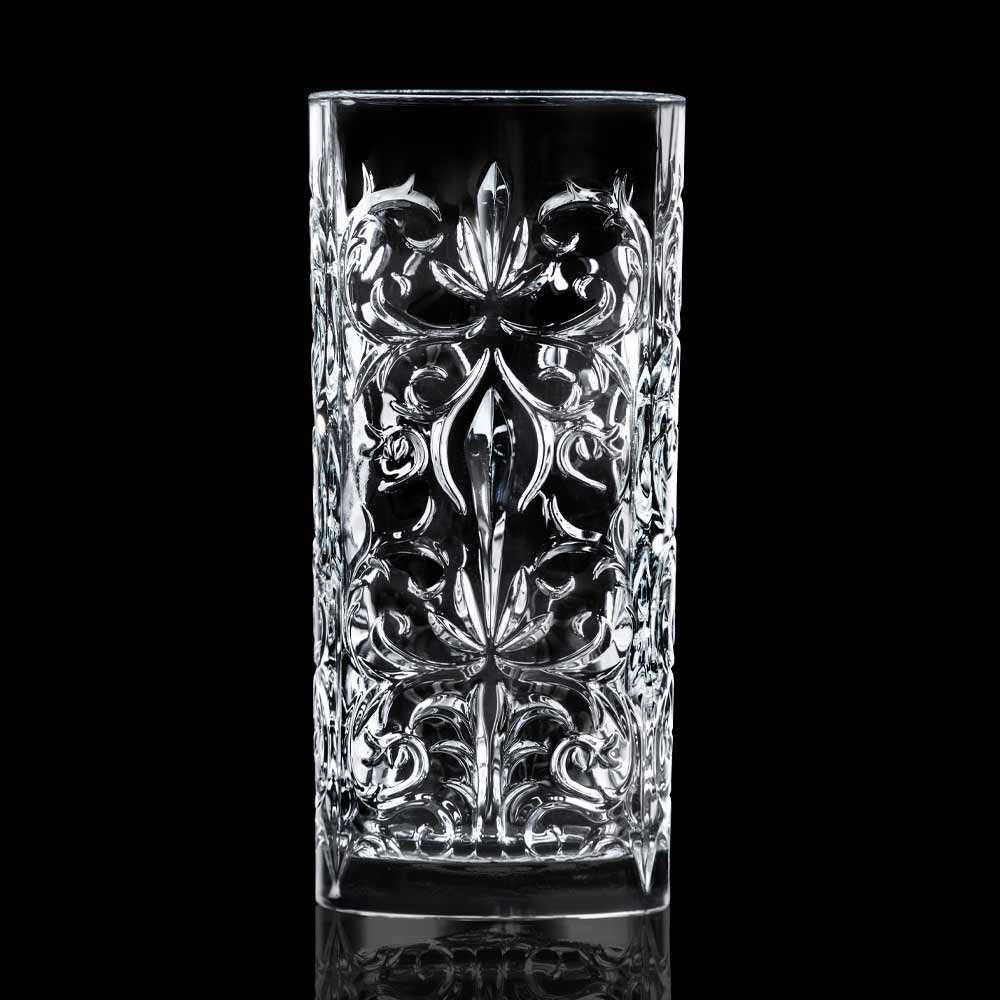 12 tall tumbler glasses for long drinks in decorated eco-crystal, quality and luxury 100% made in Italy.