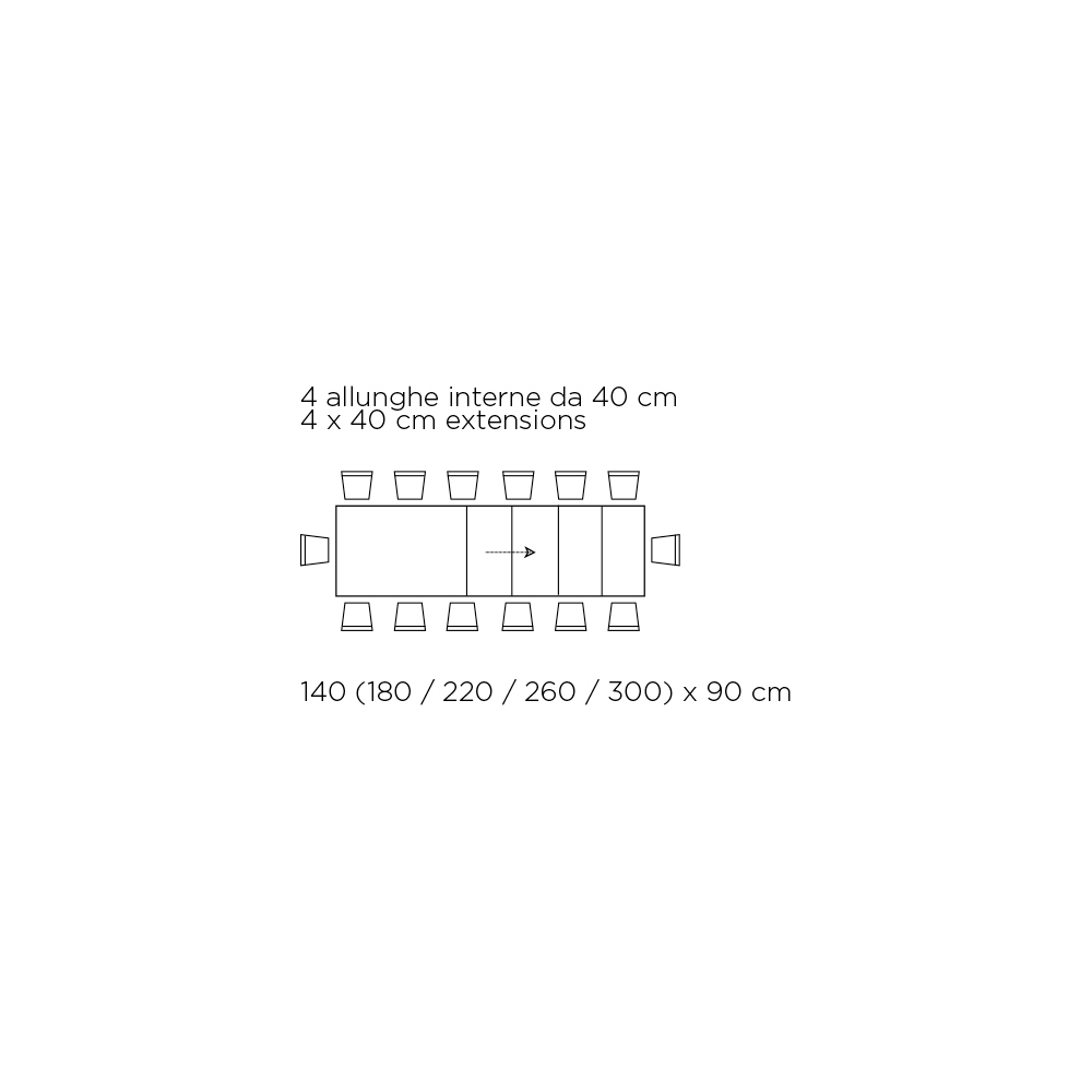 - L 140 (300) x D 90 x H 76 cm 14 seats extendable with four extensions of 40cm each inside;