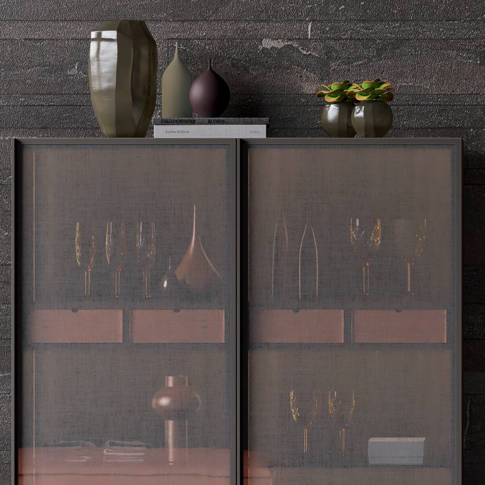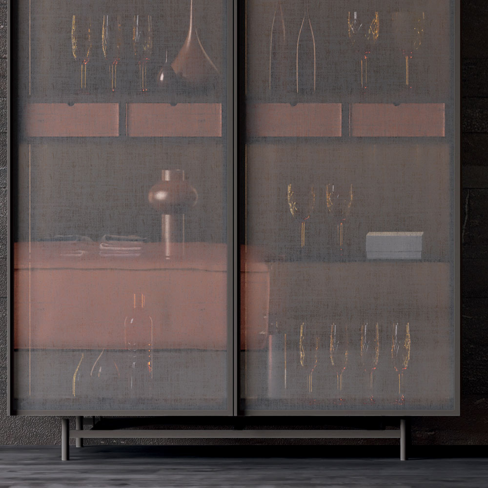 doors in silk-screened glass fabric and burnished frame. Inside the door compartments, which can be opened using the