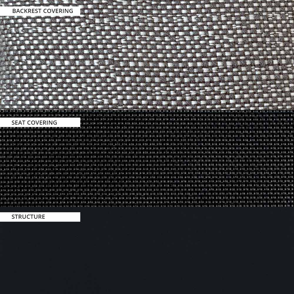 gunmetal aluminum, black textilene and zinc savannah fabric;