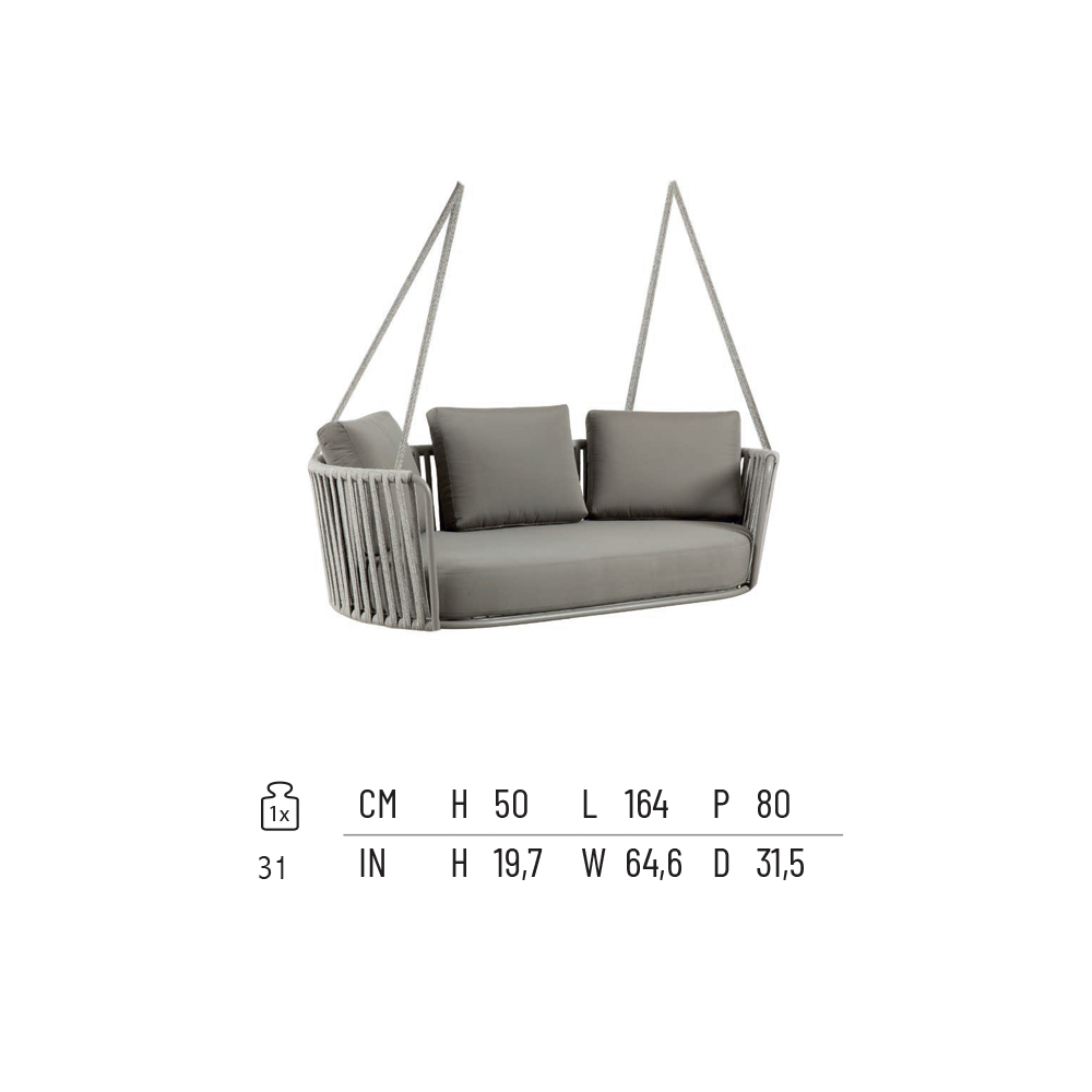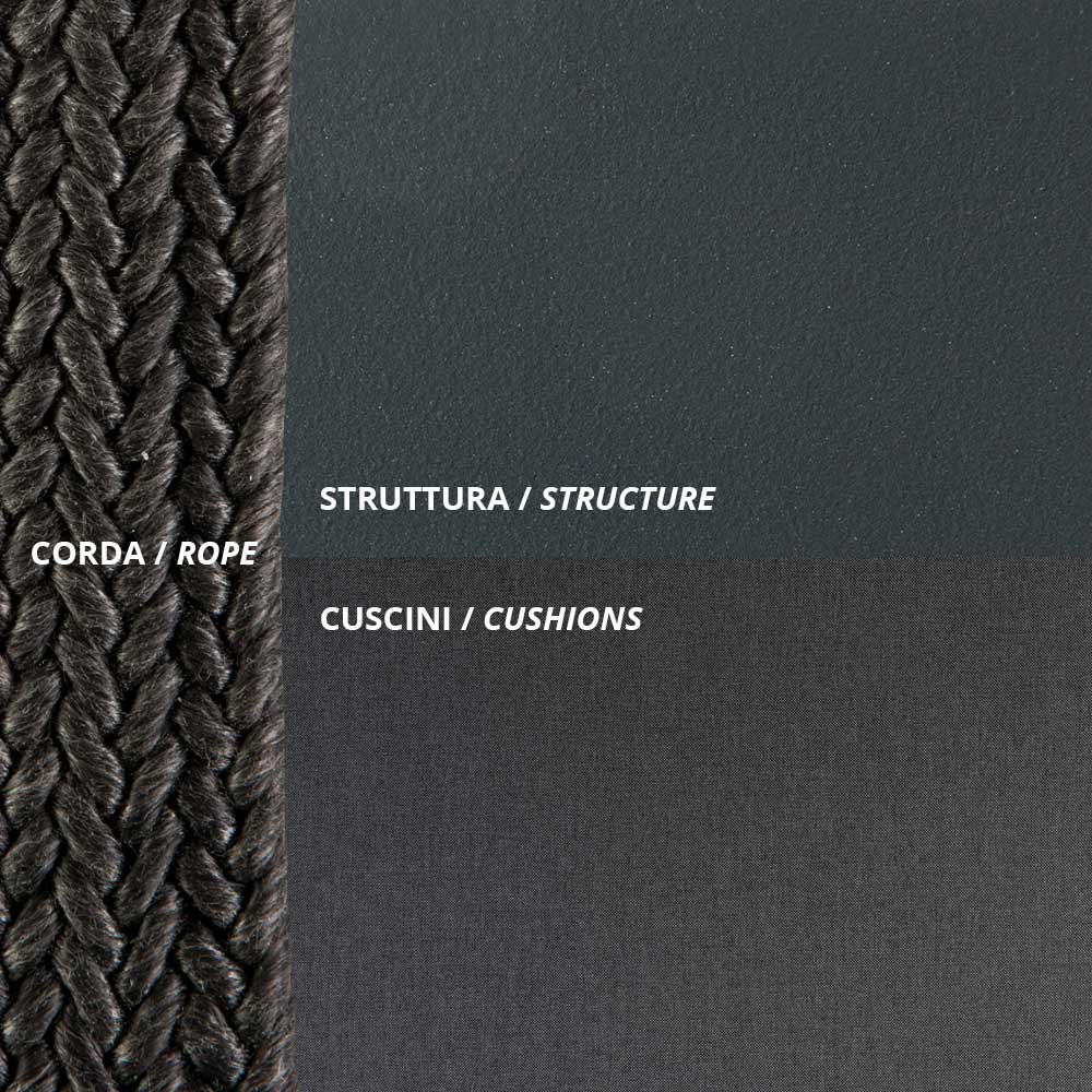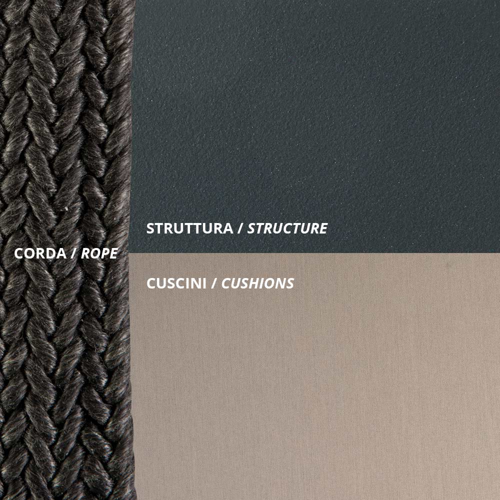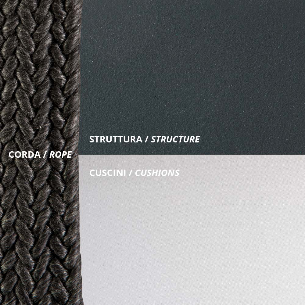 2-seater garden swing entirely made in Italy with antique gray painted metal structure and black rope and seat covered in 100% polypropylene fabric . Lightness and strength come together to give life to a casual and particular piece of furniture characterized by an original and refined design. The wide and ergonomic seat together with the welcoming and harmonious shape allows for optimal comfort while the elegant combination of selected materials gives the aesthetics of the product a refined character and a contemporary style .