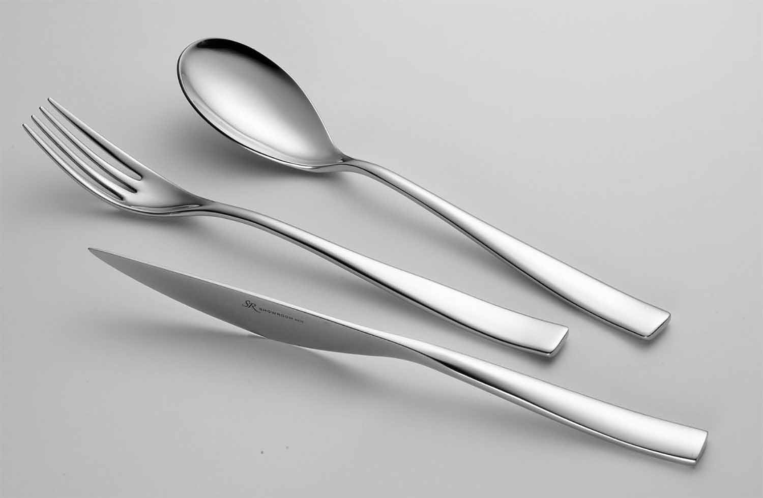 originality . The roundness of the spoon and the sinuosity of the fork give the series further personality and contrast with the wide and flat base of the handles. The
