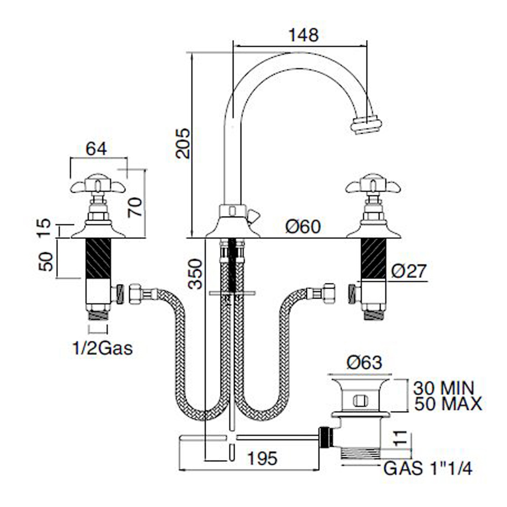 3-hole washbasin faucet with high spout and drain is entirely