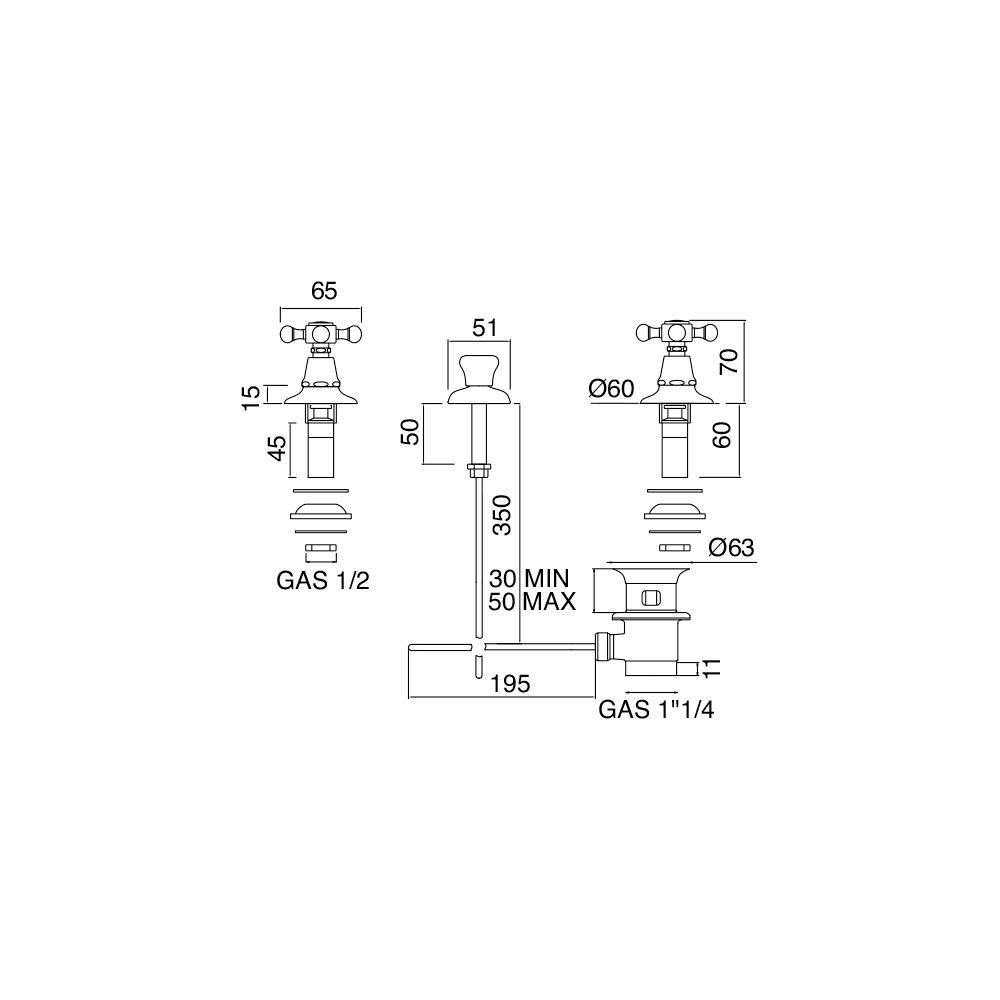 3-hole bidet mixer Ā with internal drain and delivery, made of brass.