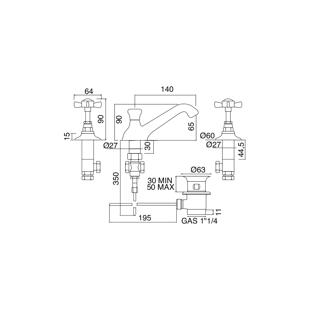 basin mixer Ā 3 holes with drain, made of brass.