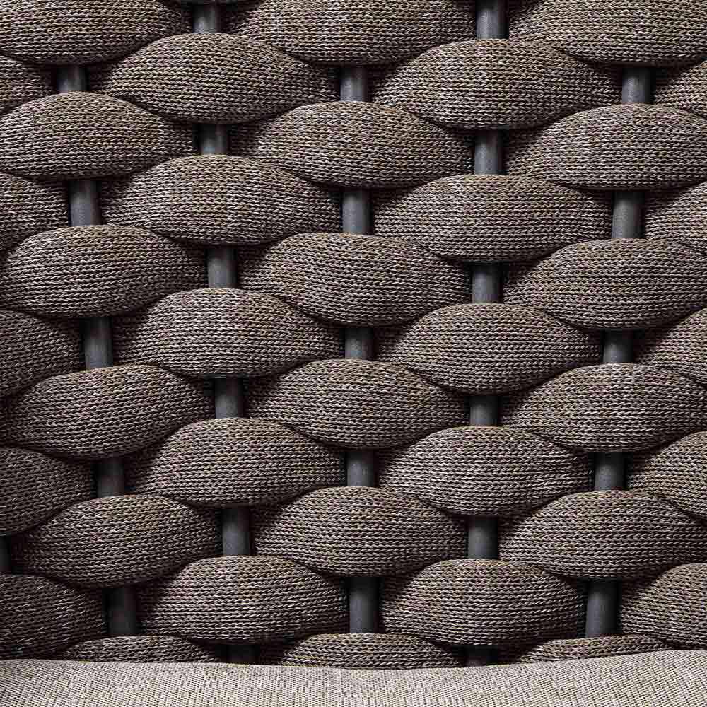 Outdoor sofa made of graphite finish painted aluminum and polyester rope weaving complete with seat and back cushions covered in brown acrylic fabric . A seat for outdoor environments that combines functionality and a pleasant aesthetic appearance, thus managing to offer a perfect furnishing solution for those looking for a product that is as comfortable and welcoming as it is elegant and capable of creating a wonderful harmony with the other elements of the furniture surrounding.