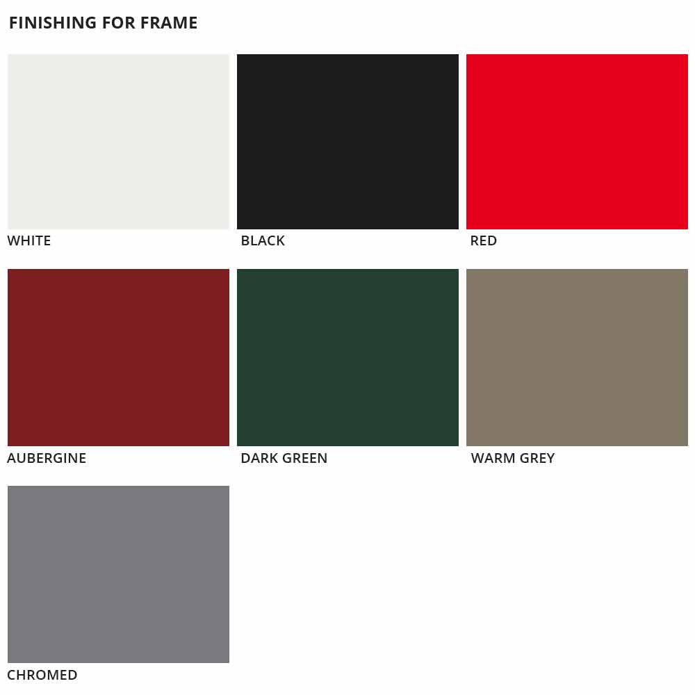 Structure finishes: - white painted metal; - black painted metal; - red painted metal; - aubergine painted metal; - dark green painted metal; - warm gray painted metal; - chrome.
