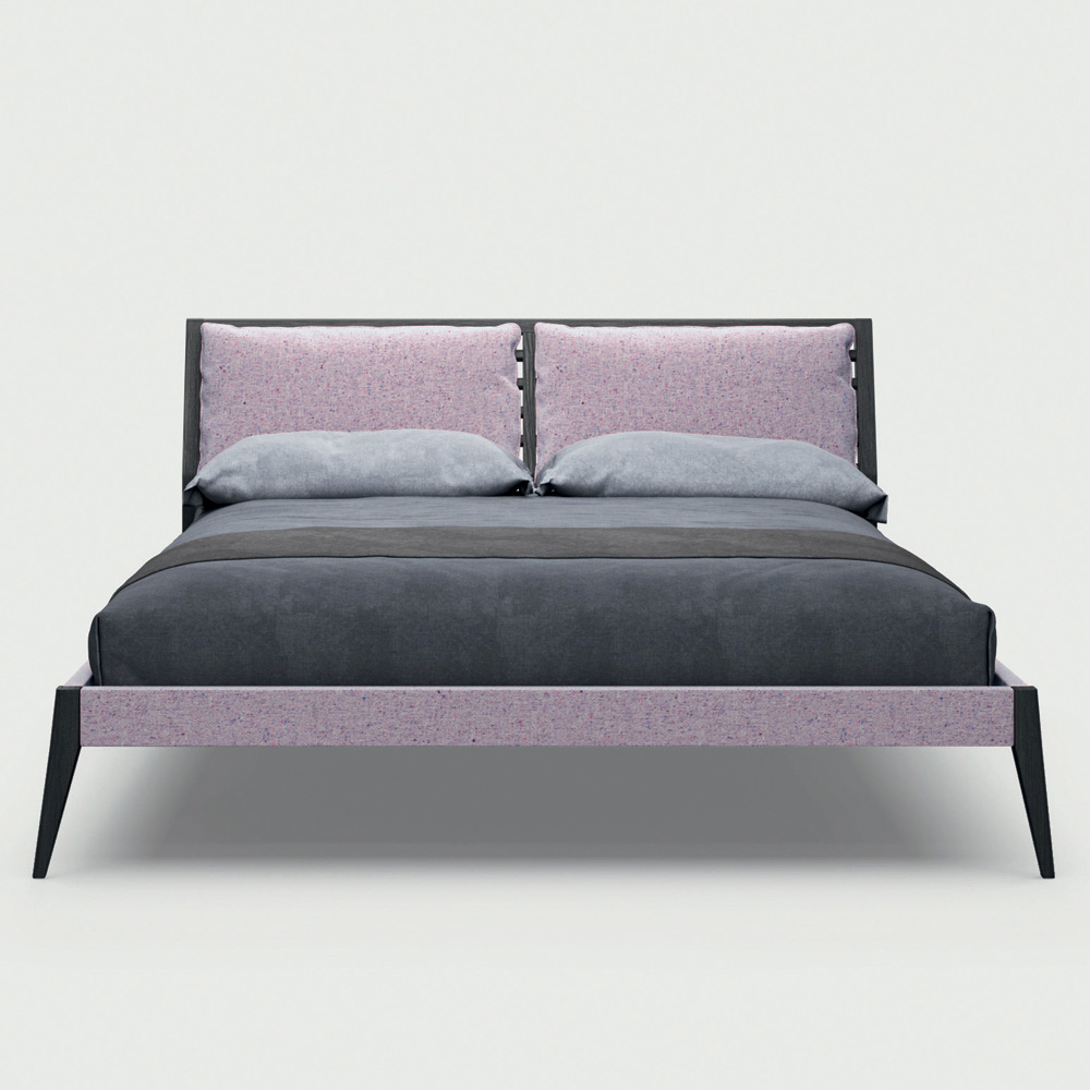 bed frame upholstered in fabric matching the two cushions covering the headboard,