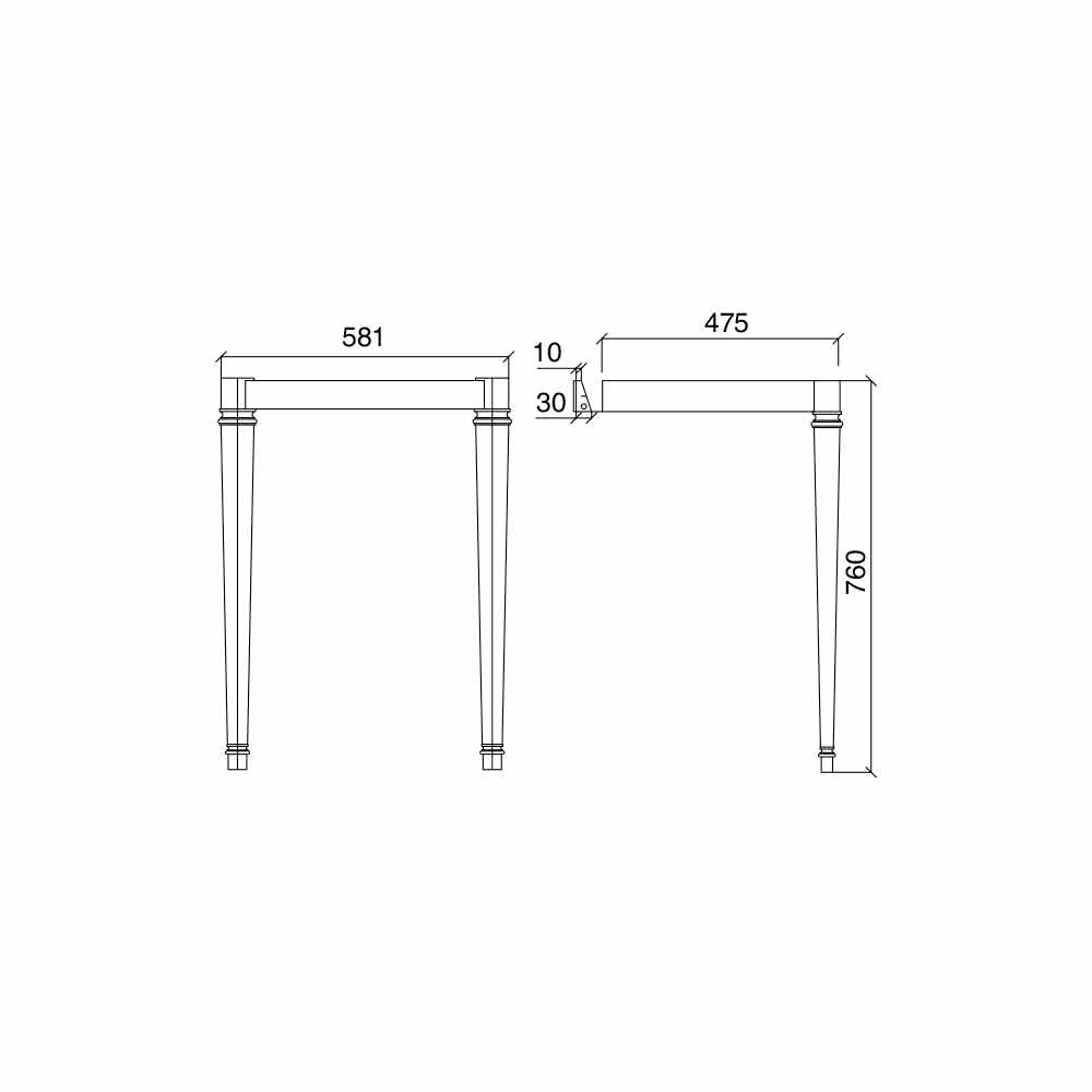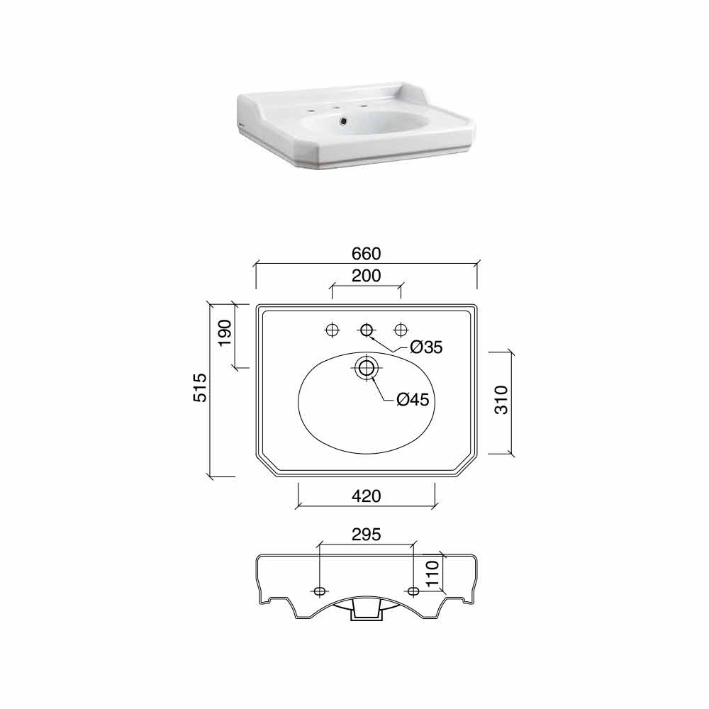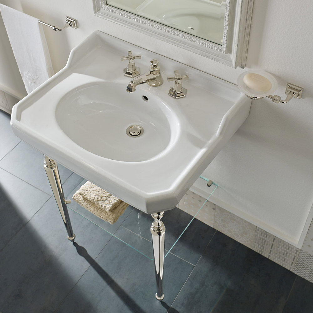 1 or 3 tap holes (to be specified when ordering). The length is 650 mm. The base is made of nickel finish metal.