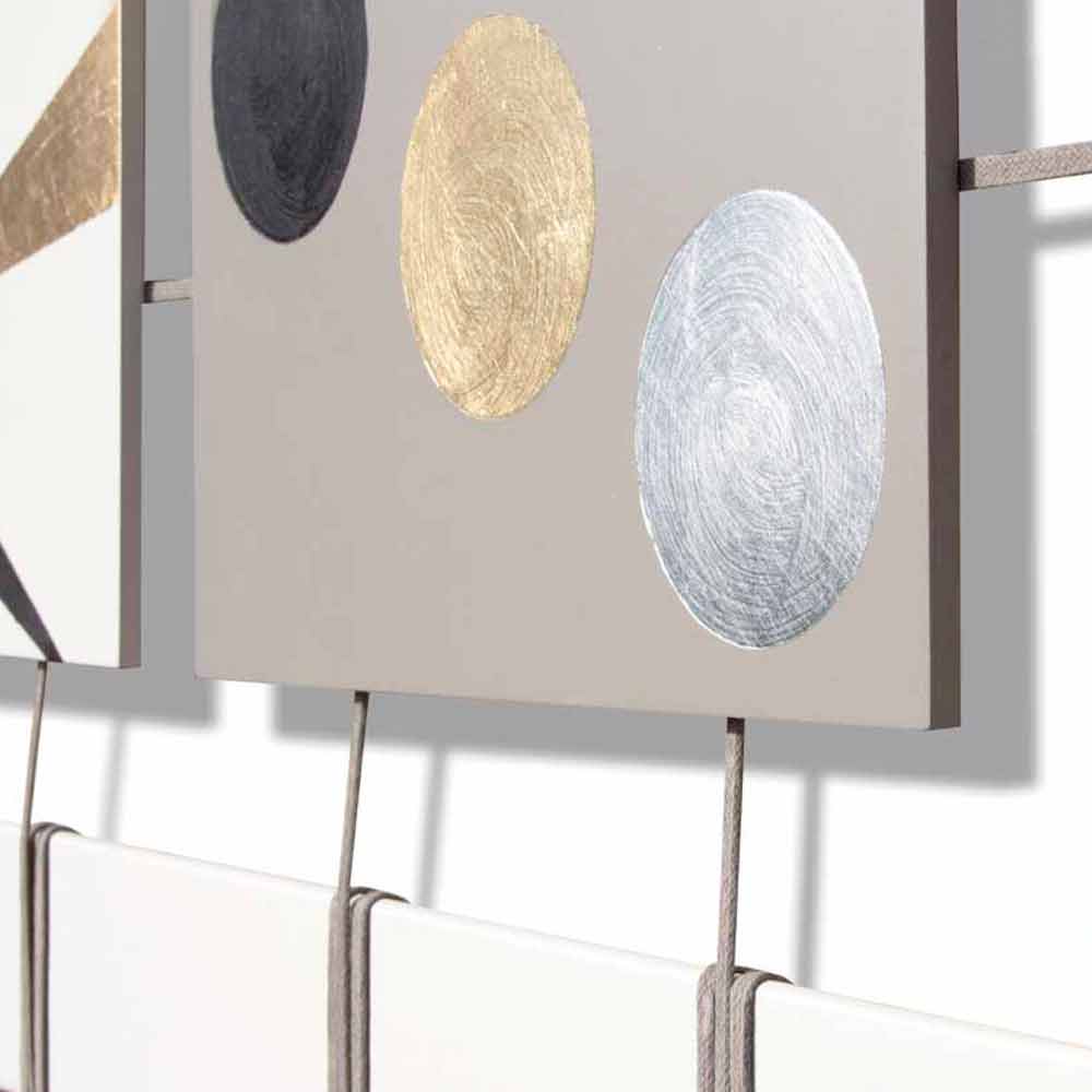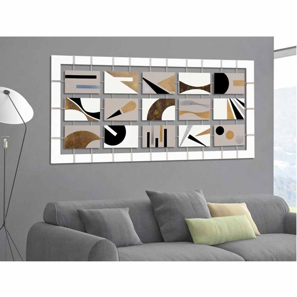 Modern design wall painting with a white wooden frame and fifteen MDF panels. The hanging panels are lacquered in the colours ivory and taupe and are decorated with gold,silver and lead leaf.