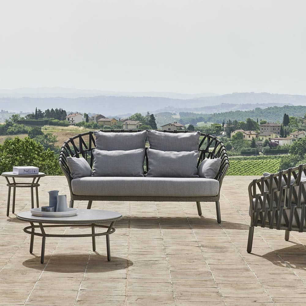 Two-seater sofa made in Italy with structure in powder- coated aluminum with gray finish , hand-woven backrest with anthracite-colored band andsix cushions with charcoal-colored dryfeel fillingĀ included. This piece of furniture has been designed both to satisfy the eye with its elegant aesthetics and to guarantee authentic comfort.