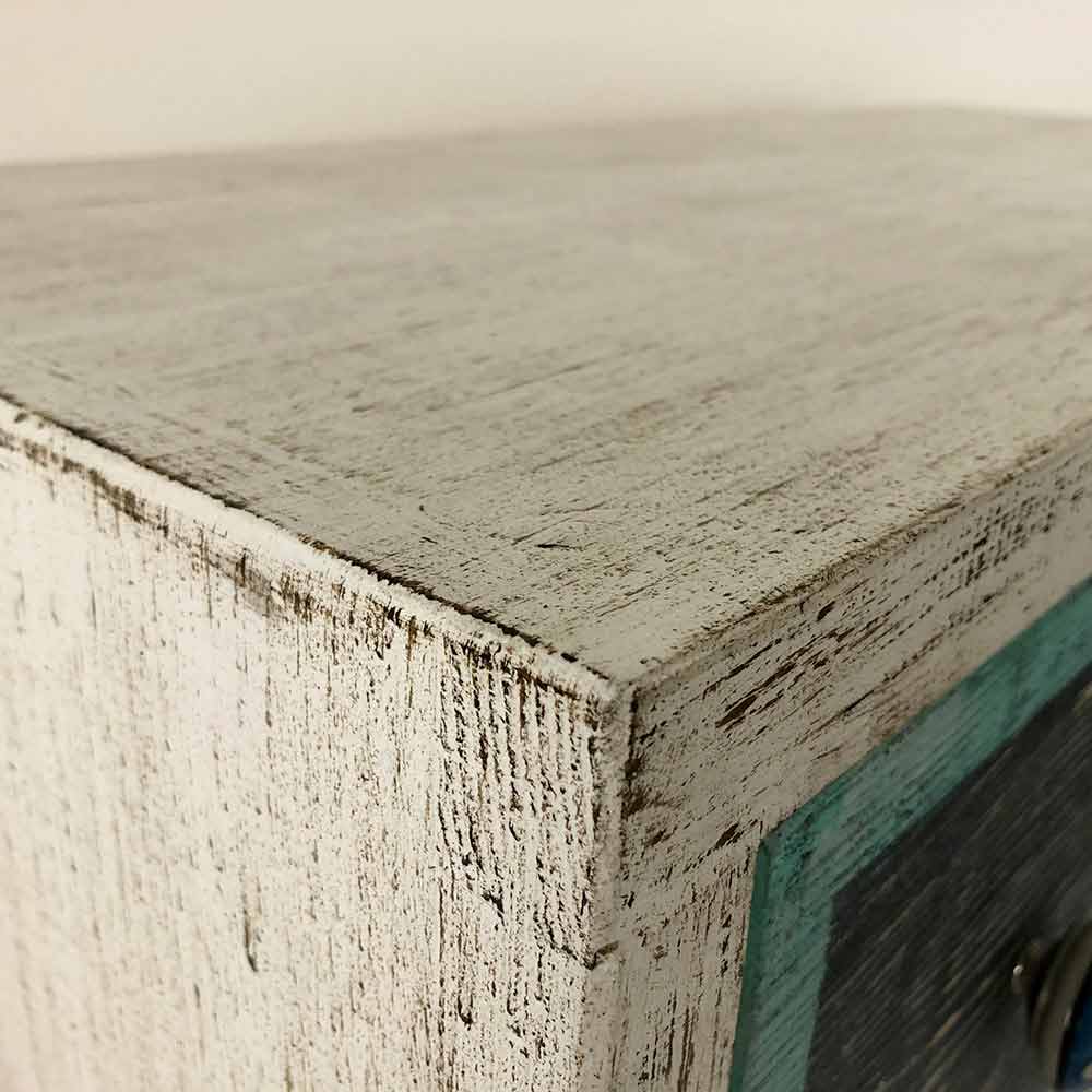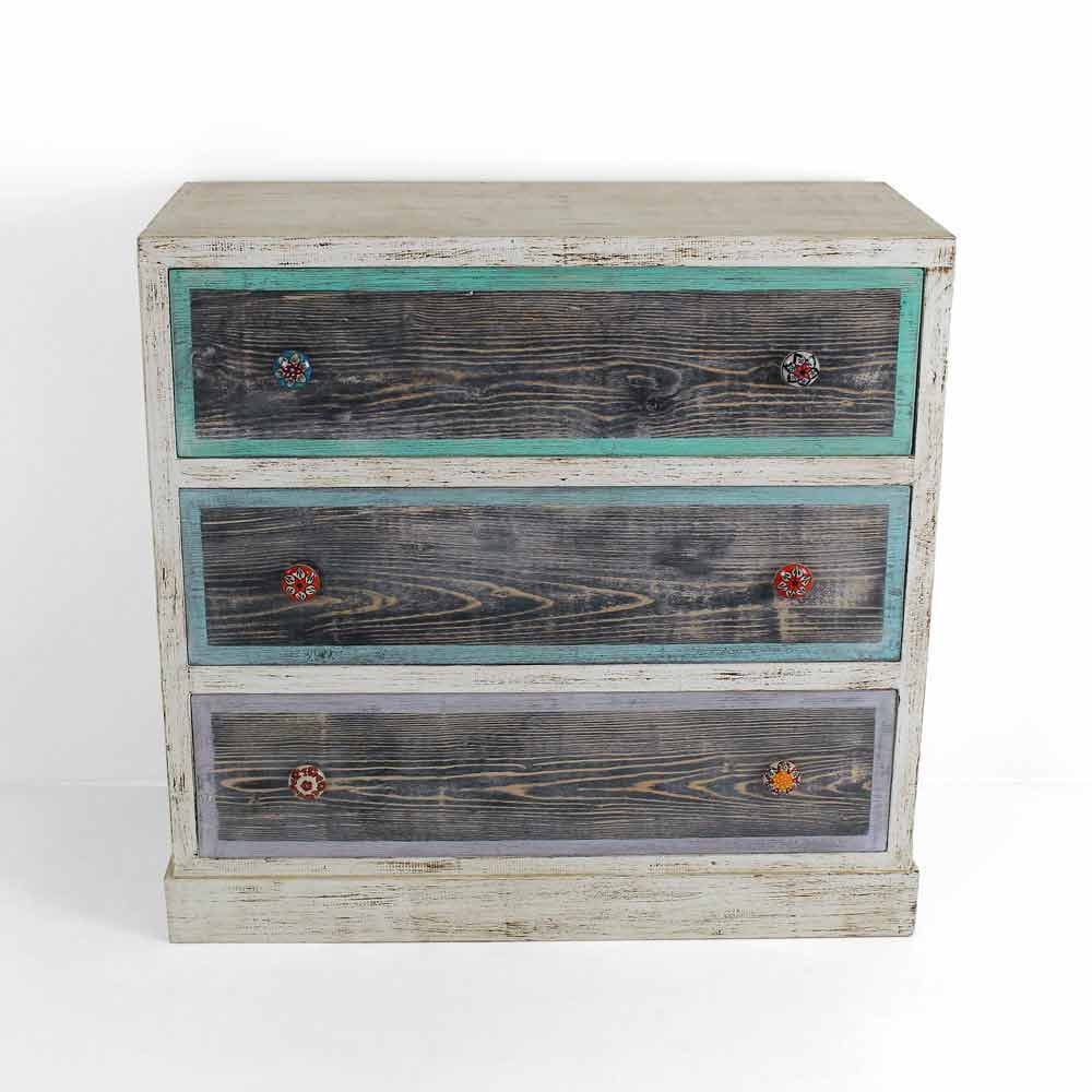 Handcrafted chest of drawers made in Italy in solid fir wood with 3 drawers in poplar plywood with hand-painted wooden front and ceramic knobs. The structure of the product has an aged white finish while the drawers are decorated in flayed black with colored edges. These wonderful colors are obtained thanks to the use of natural lands aggregated with glues of animal origin, materials chosen as an alternative to common industrial paints. This is done in an attempt to minimize the use of formaldehyde, a harmful substance recognized as a carcinogen. In this way it is possible to lower the level of toxicity, thus creating a functional and fascinating product and a healthier atmosphere. The chest of drawers is finally completed with a transparent finish that makes it water-repellent and fixes the colors to make them unchangeable over time.