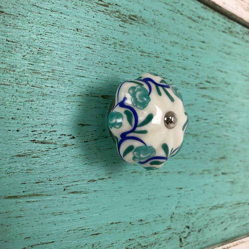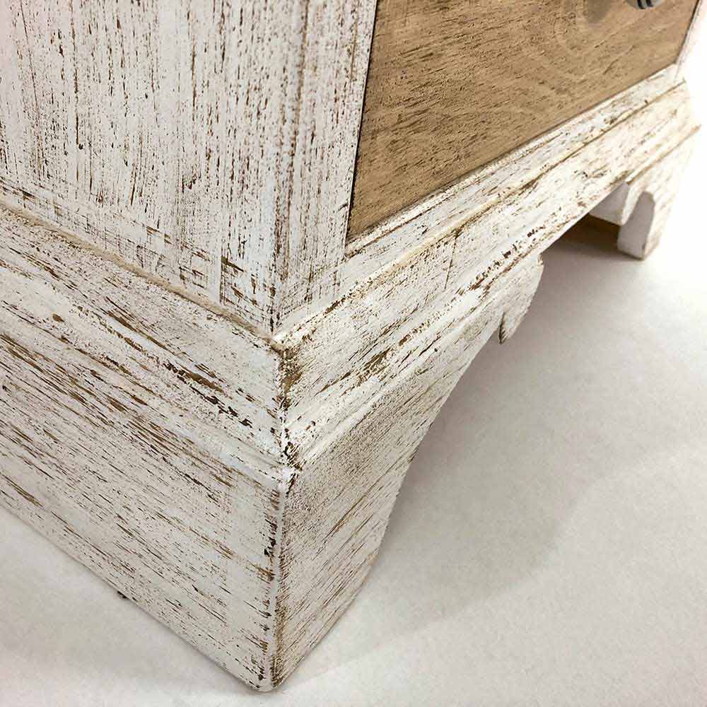 Chest of drawers in solid abet wood and handmade in Italy in aged white finish. The 4 drawers have a 10 mm poplar plywood structure to keep more space inside them, while the front panel is in 18 mm wood and is completed by special hand-painted ceramic knobs. The wonderful colors that enrich the drawers are obtained thanks to the use of natural lands aggregated with glues of animal origin, materials chosen as an alternative to common industrial paints. This choice of construction means that each article can minimize the presence of formaldehyde, a harmful substance classified as a carcinogen. The chest of drawers is finally completed with a transparent finish that makes it water-repellent and fixes the colors to make them unchangeable over time.