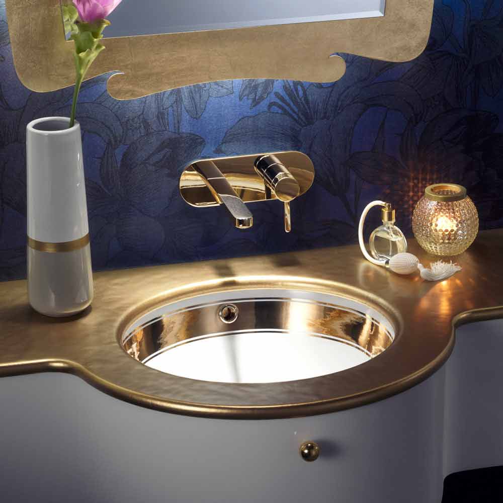 Bathroom undertop sink made in Italy in fire clay, handmade in Italy with stripe and braid in 24k gold.
