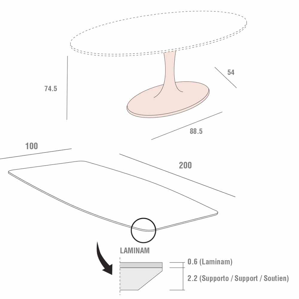 laminam (thickness 6 mm) equipped with a 22 mm support and base in