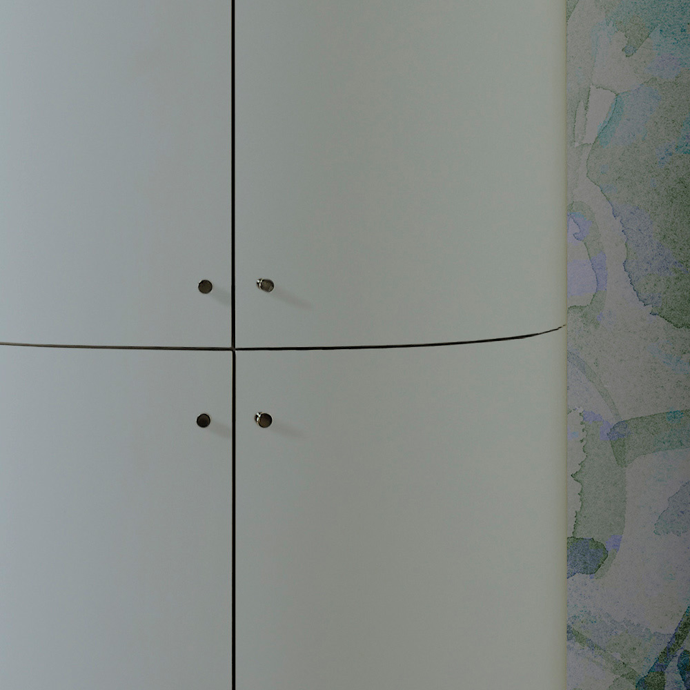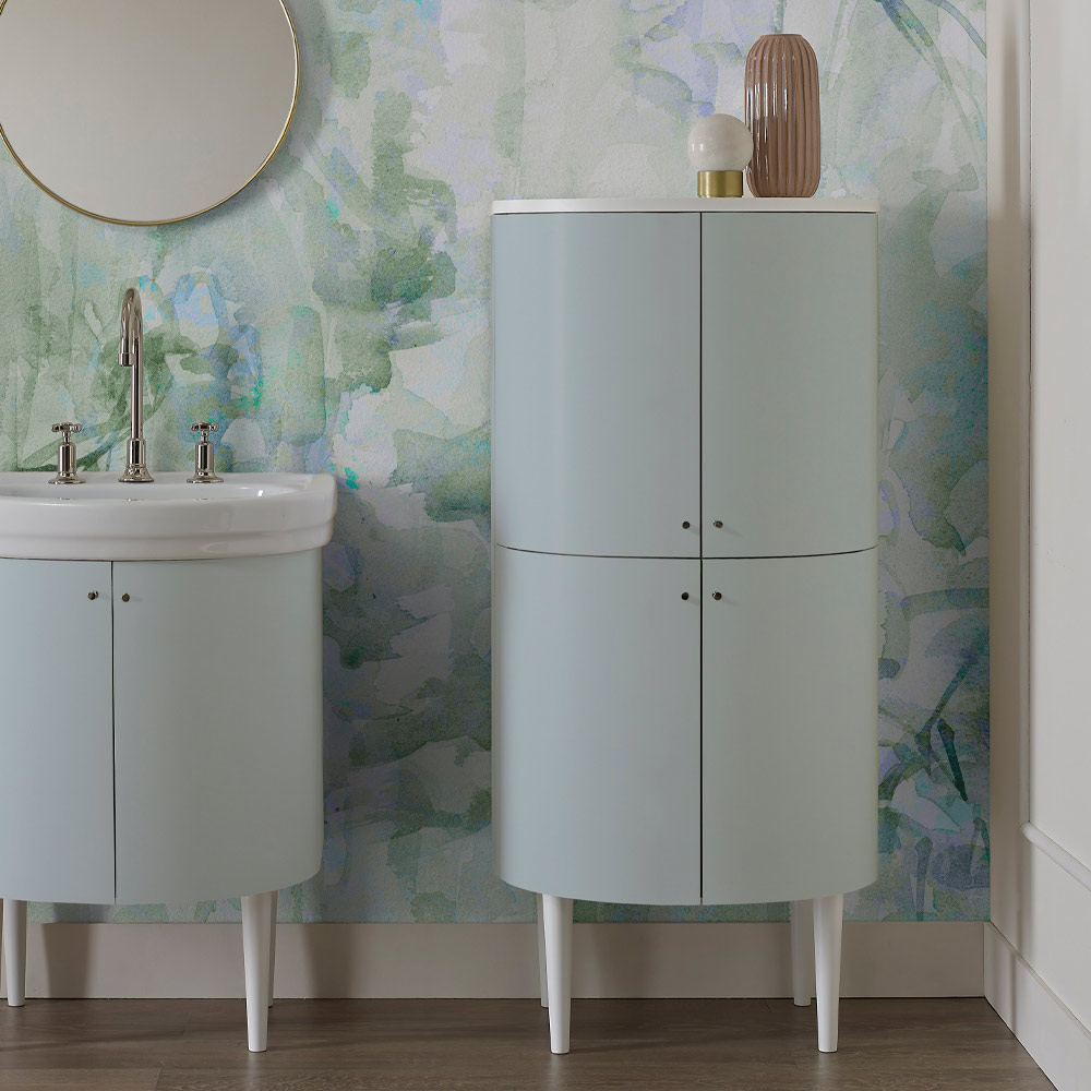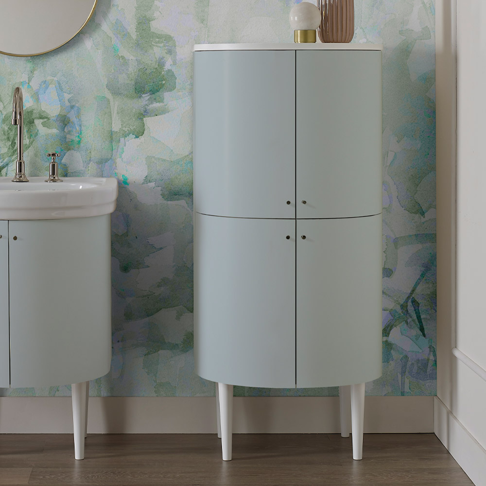 MDF column with fourdoors light blue matt finish which close off three shelves, two of which in glass and one in Hydro MDF. The top shelf and the legs are in a matt white finish and the knobs are included in a nickel finish.