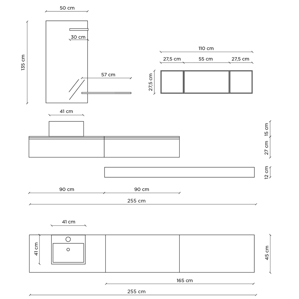 Also included are the 4 hanging cubes in shiny blue/light blue and black lacquered metal and the shaped shelf in front of the mirror in shiny white MDF.