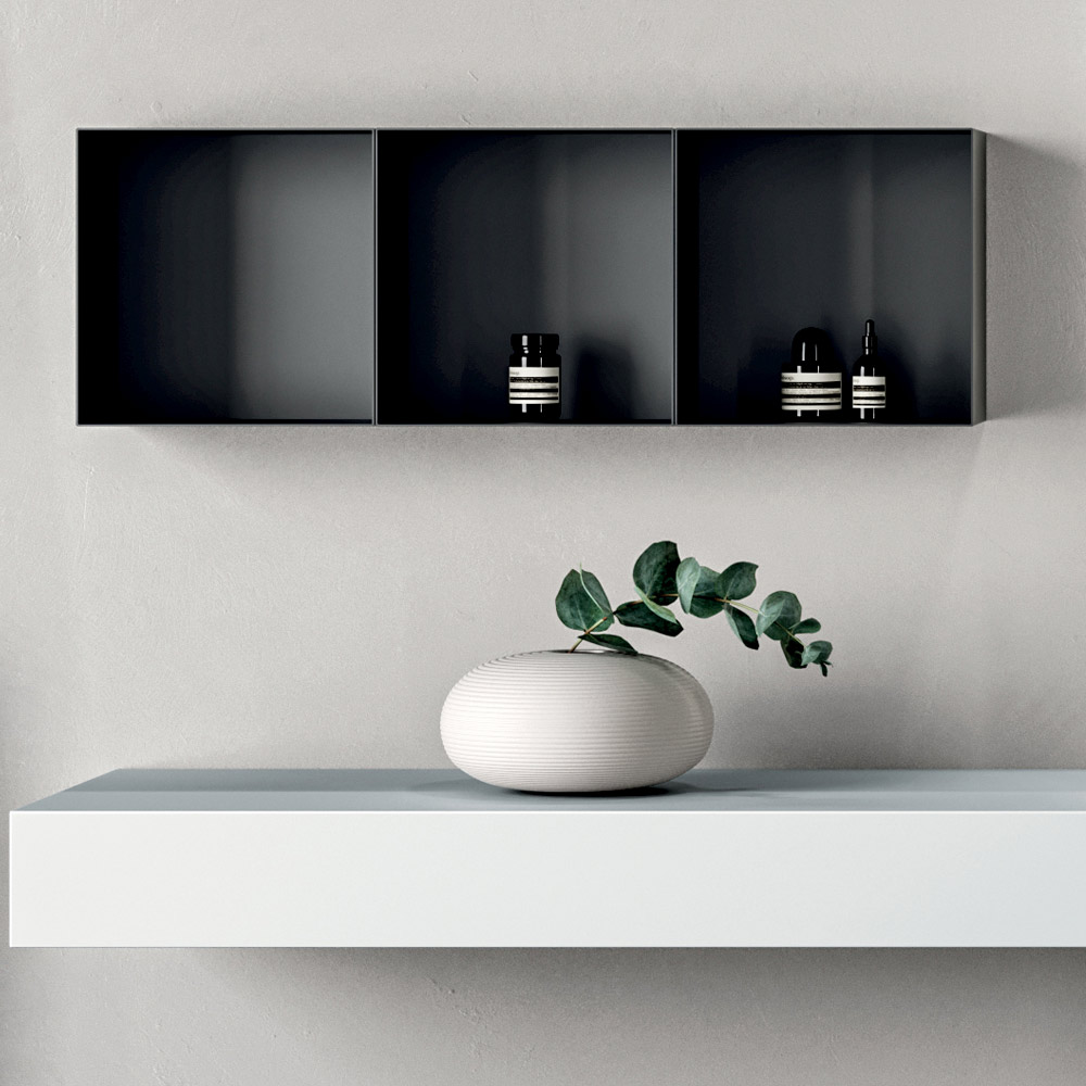 The 3 black metal wall units create an elegant color contrast and add vertical storage space, making the composition dynamic and modern.
