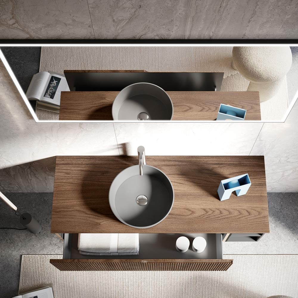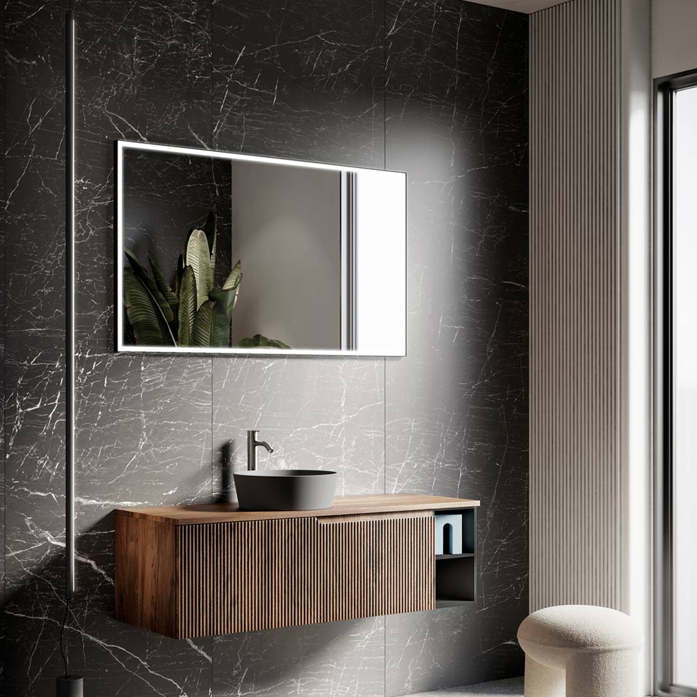 Bathroom composition entirely made in Italy consisting of a base with 1 drawer in MDF with ribbed Rio oak finish, an open element in smooth anthracite MDF, a matt black ceramic washbasin , a mirror with front LED light and black frame. This bathroom composition was created to combine modern style with functionality so as to be able to respond to different design needs and be able to give a unique touch to the space. The simple and linear finishes make this furniture elegant and chic at the same time and blend with the great quality and resistance of the materials used for its creation.