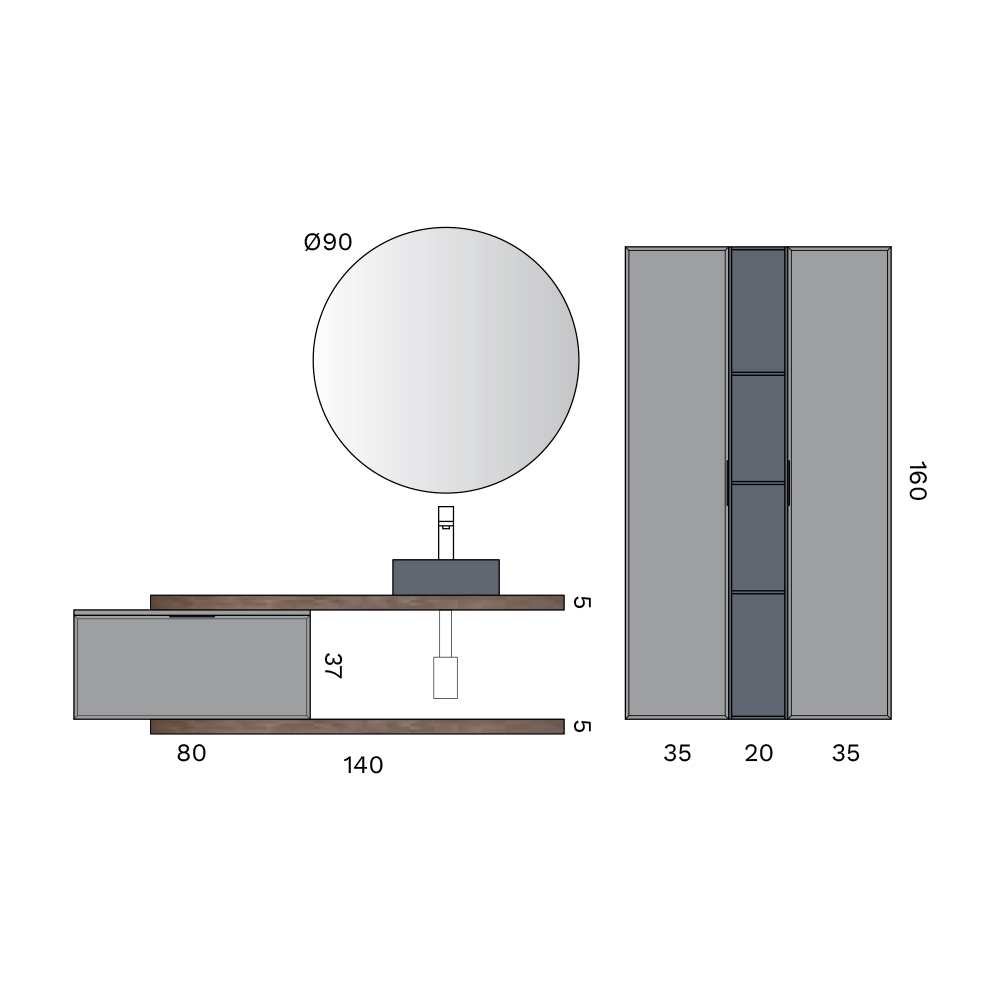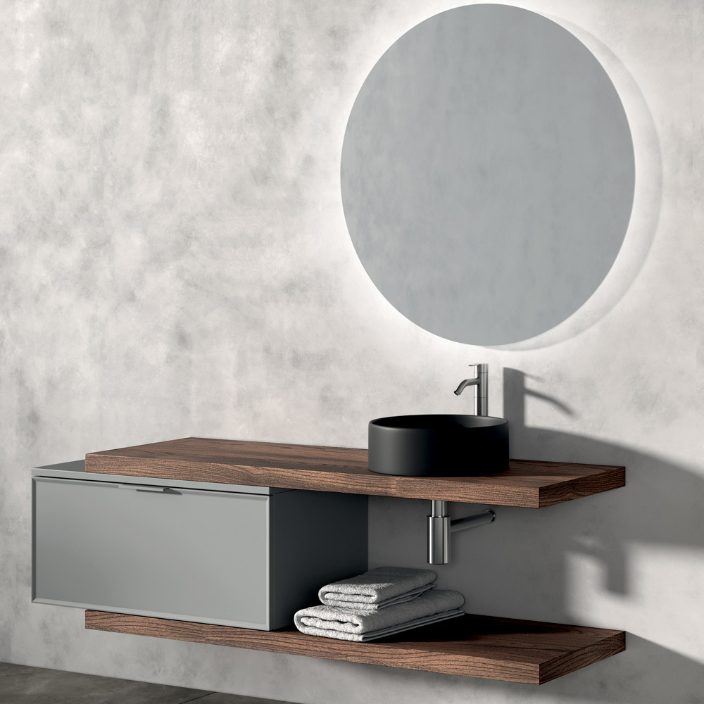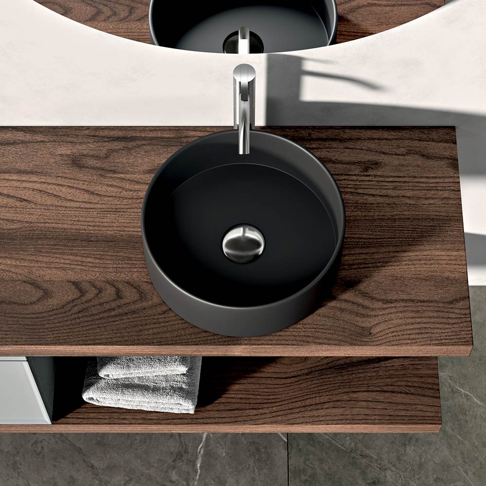 The 2 Rio oak tops introduce a natural and warm element, creating a pleasant material contrast with the round countertop washbasin in matt black ceramic , the true visual protagonist of the composition.
