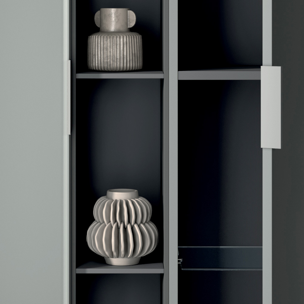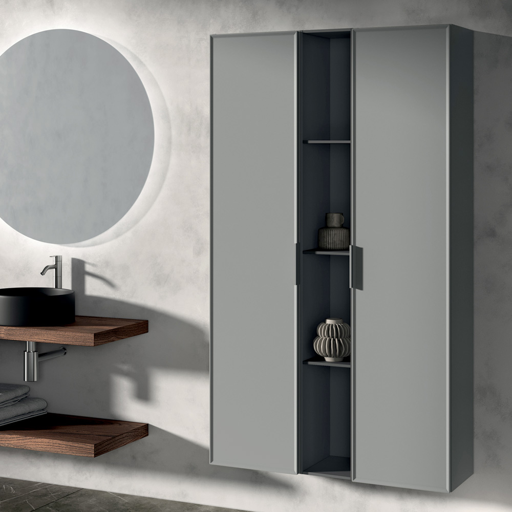 The composition is enriched by vertical storage columns and an anthracite open element , perfect for organizing accessories and objects while maintaining a tidy and contemporary style.