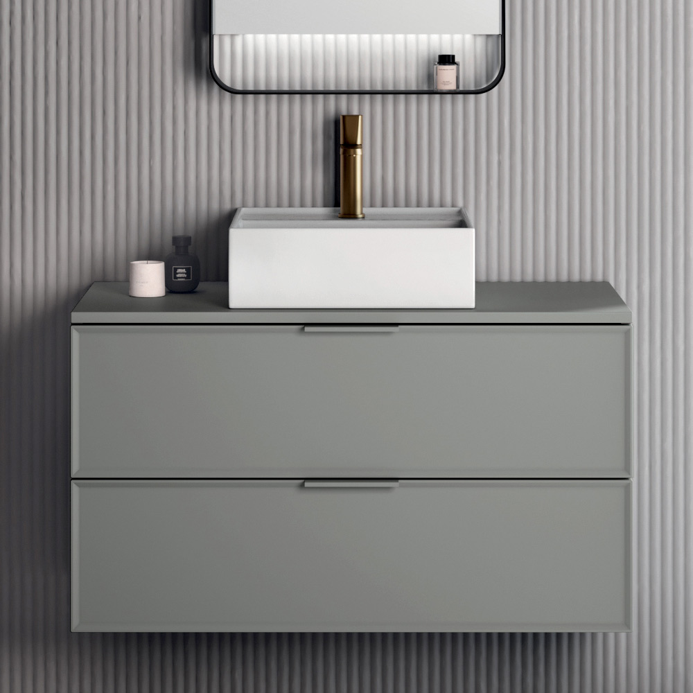 A refined, modern bathroom composition with a simple and elegant character, ideal for contemporary and minimalist spaces. The matte gray finish lends a sense of sobriety and versatility, easily adapting to a variety of interior design styles.