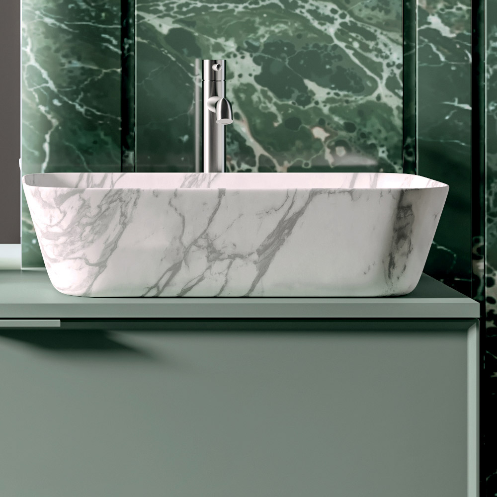 The Calacatta-effect ceramic countertop washbasin introduces a highly valuable material element, with delicate veining that recalls natural marble and embellishes the entire bathroom decor.