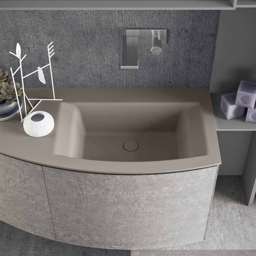 Bathroom furniture set with curved fronts in unicolor portland HPL , suspended column in unicolor portland HPL H 162 cm, integrated washbasin in matt dove gray Teknorit , open element in matt mouse lacquer, thick bench H 10 cm.
