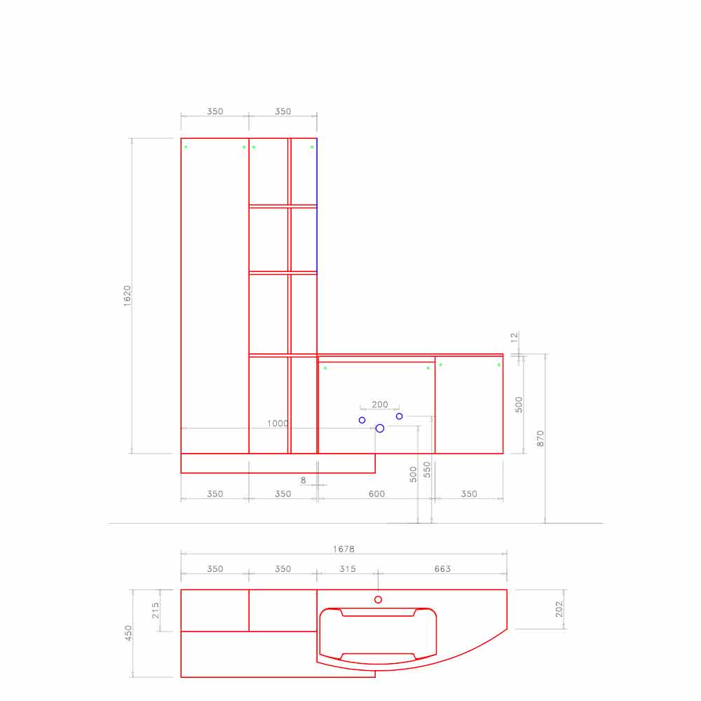 This formal clarity is given by the groove door with an inclined profile. The peculiarity of this composition is given by the built-in washbasin characterized by two lateral sides that gently descend towards the basin and by the curved wall unit that contains it.