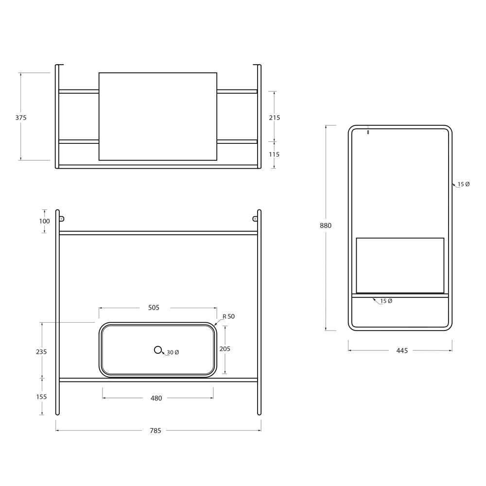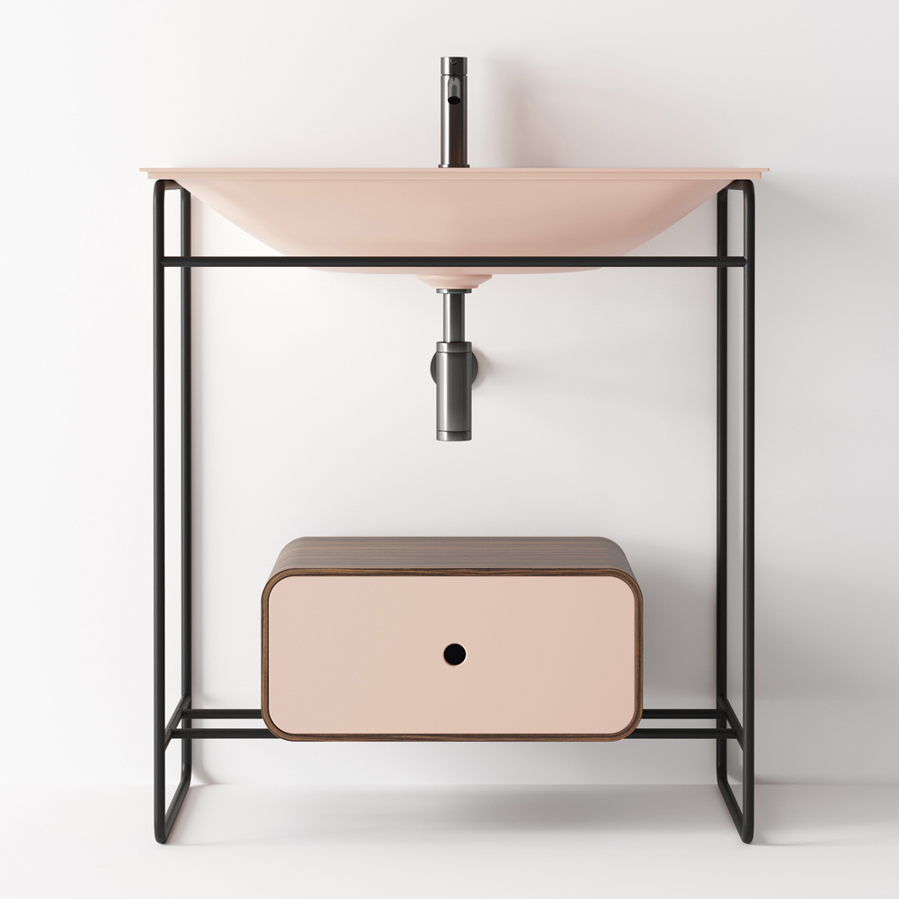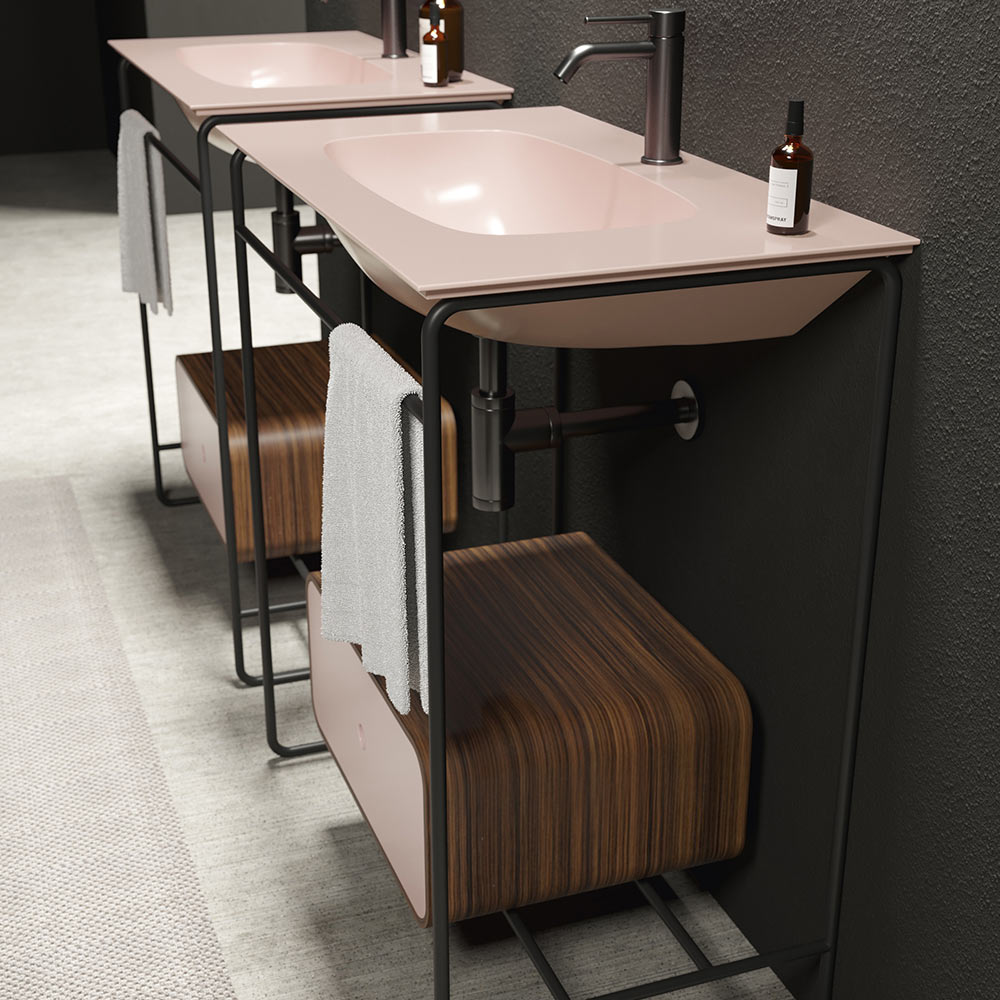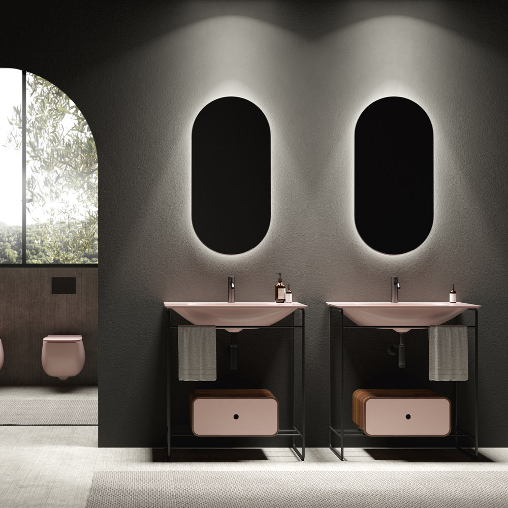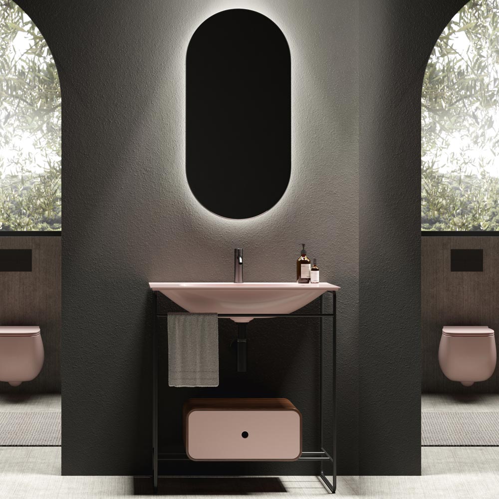 Bathroom cabinet composition including a ceramic washbasin with base and mirror. The washbasin is characterized by rigorous geometries and soft details that create refined and peculiar atmospheres. The base has a matt black finish stainless steel structure with an ebony finish wooden drawer and front in the same color as the washbasin, while the backlit oval mirror has a matt black finish aluminum frame.