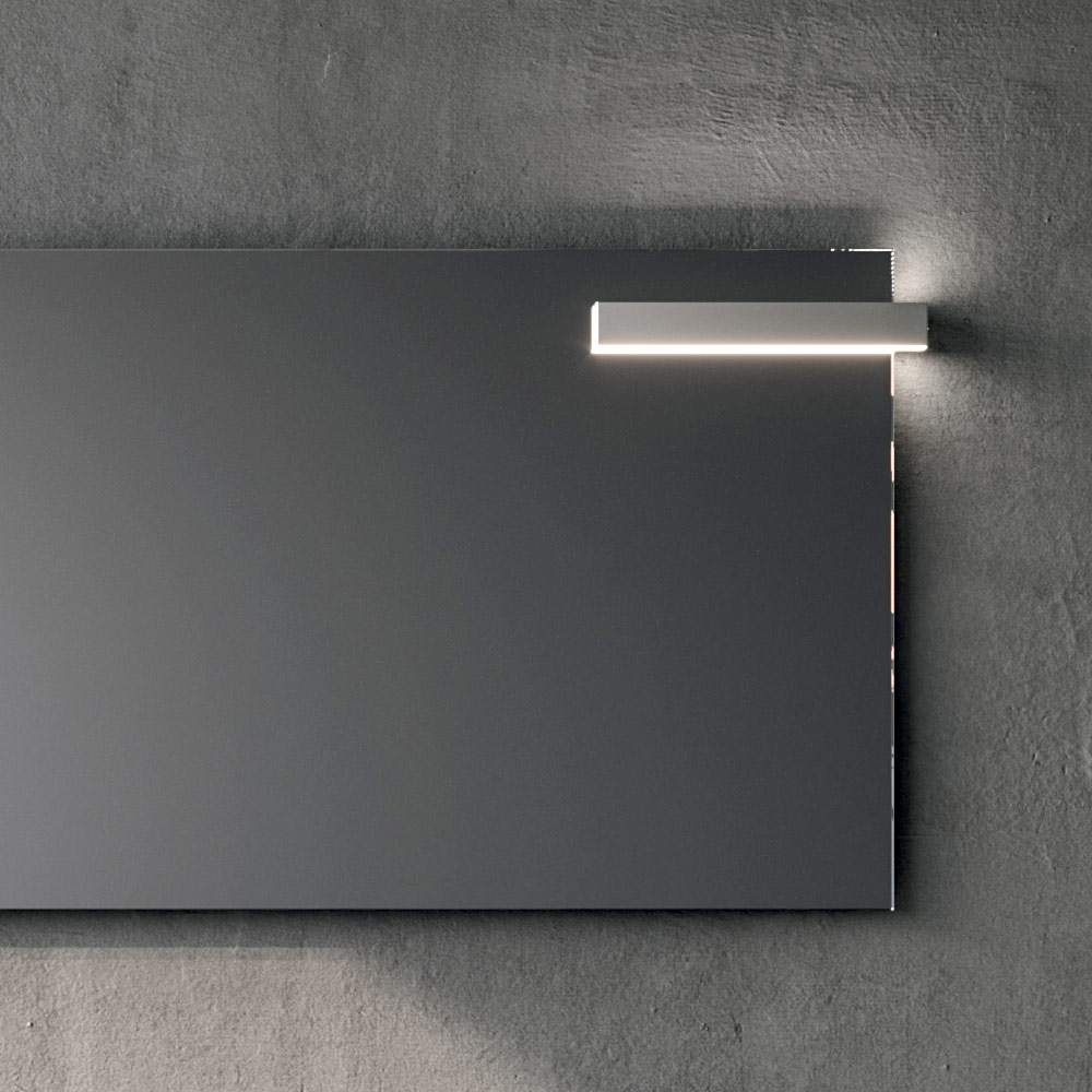 The rectangular mirror with LED lighting ensures uniform and functional light, perfect for everyday activities, while helping to emphasize the clean lines and depth of the space.