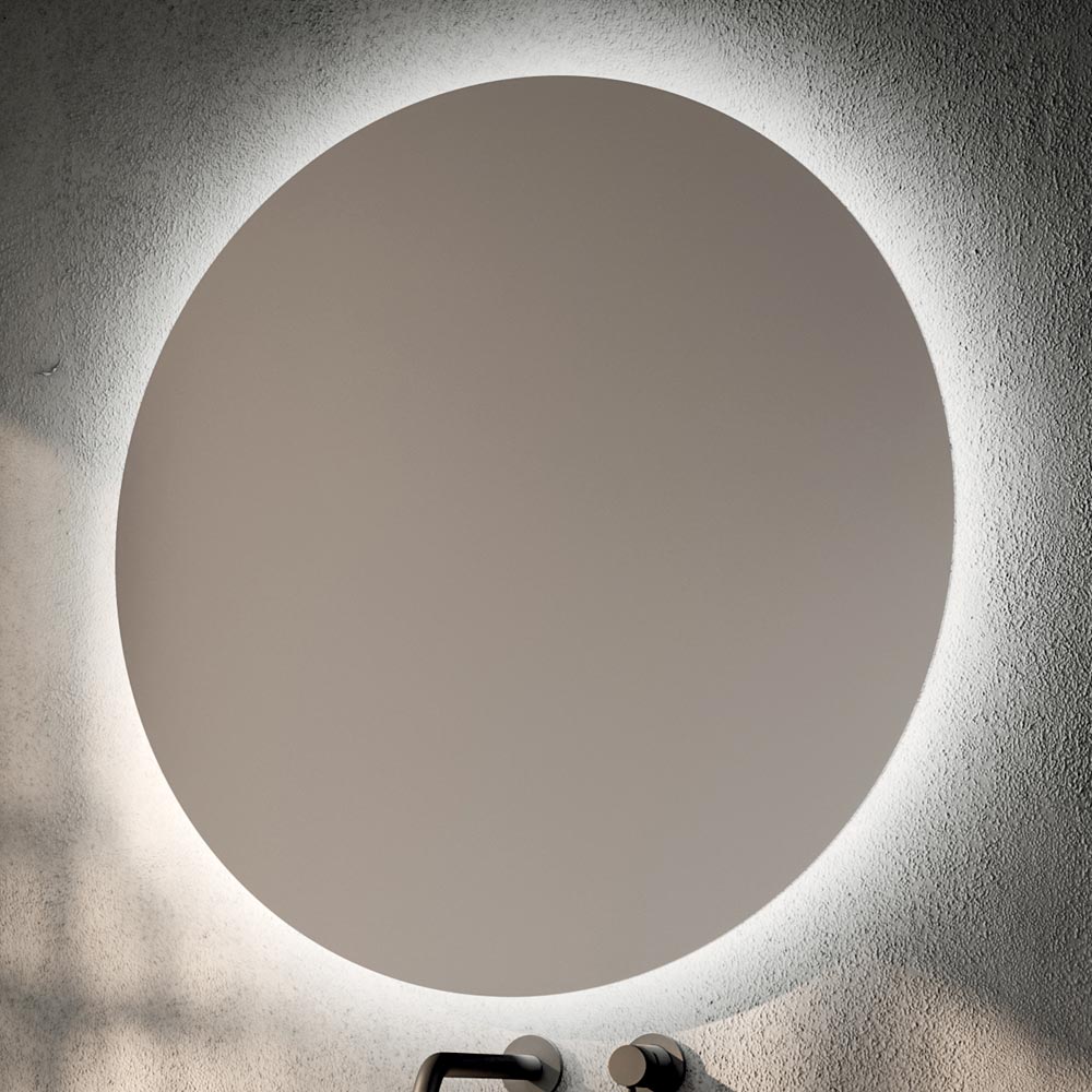 The round resin sink , with its soft, minimal profile, integrates perfectly with the top, while the backlit mirror amplifies the brightness and gives visual depth to the wall, helping to create a relaxing, modern atmosphere.