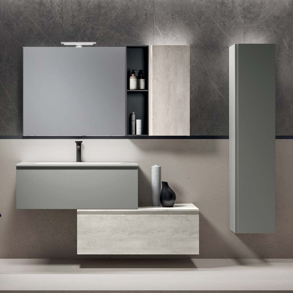 The suspended wall unit in Alaskan oak finish and the anthracite open element enrich the structure with functional and decorative solutions, ideal for organizing and personalising the bathroom space with elegance and practicality.