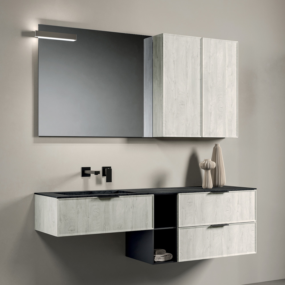 The composition is completed by the rectangular mirror and the LED lamp , which ensure functional and scenographic lighting, ideal for enhancing the sink area and improving visual comfort.