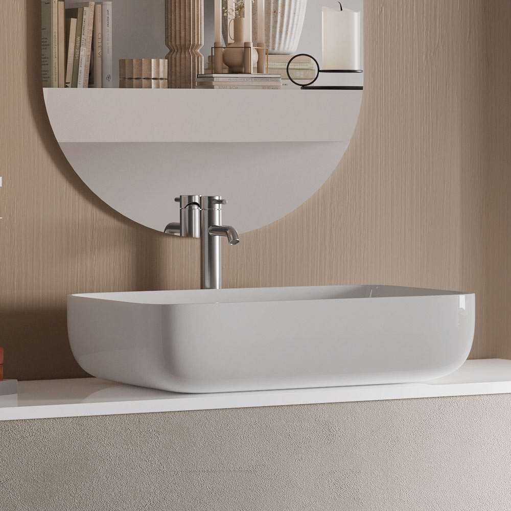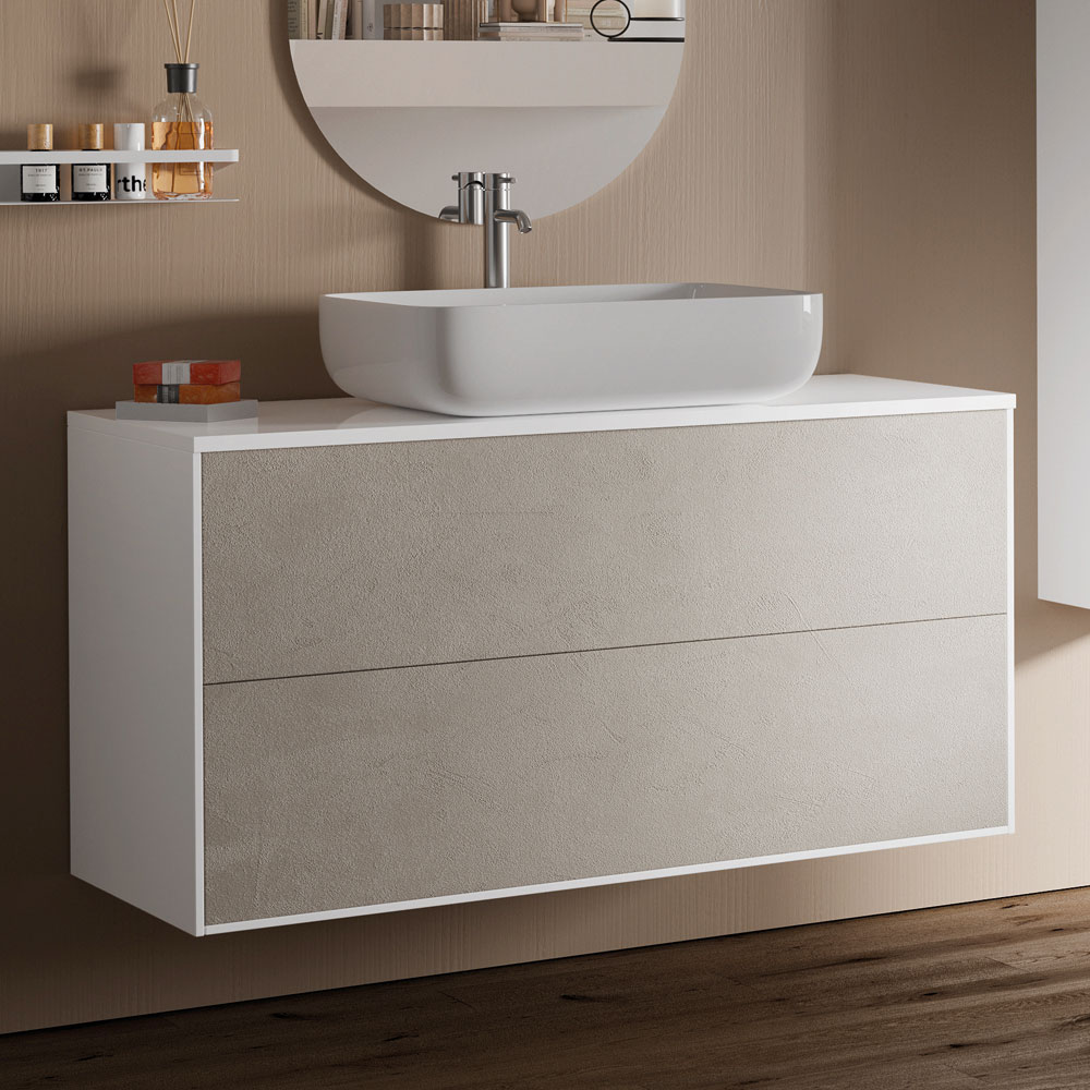 Bathroom composition with baseĀ in scratch-resistant melamine with 2 fully extractable drawers and soft close closure in Havana stone color , oval mirror and console sink in glossy white ceramic. Elegance and refinement are the key words to describe this product which come together in finishes and materials that create an extremely practical and functional bathroom furniture. The simple and sophisticated design makes these elements perfect to meet everyone's taste and style needs.