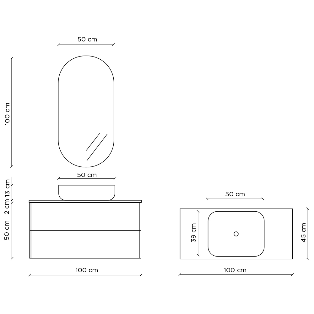 Dimensions: Base: L 100cm x D 45cm x H 52cm Washbasin: L 50cm x D 39cm x H 13cm Mirror: H 100cm x W 50cm