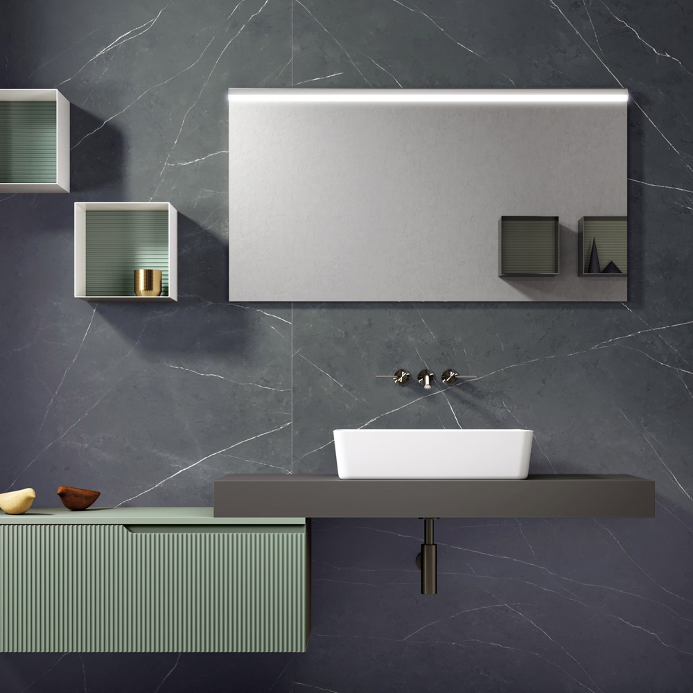 Bathroom composition entirely made in Italy consisting of a base with 1 drawer in MDF with ribbed sage green finish, anthracite boxed sink top , a white ceramic washbasin , mirror with single front LED light, 2 white metal wall units and ribbed sage green background. It is a furnishing solution adaptable to multiple configurations of use and is particularly versatile, born following the union between attention to detail and the search for an essential design.