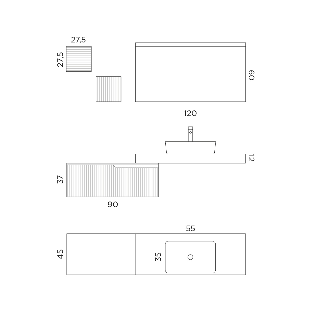 Base with 1 drawer: Length 90 cm x Depth 45 cm x Height 37 cm
