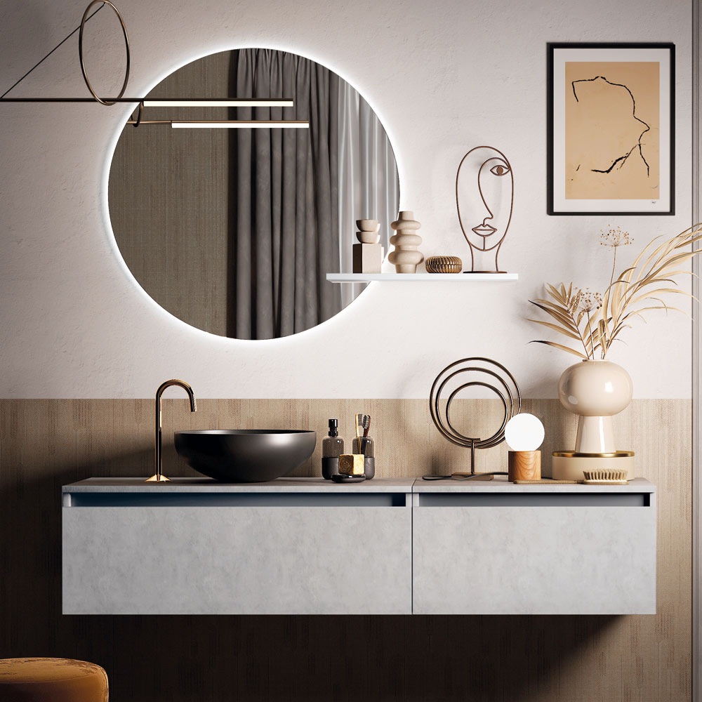 Bathroom composition with glossy resin washbasin with glossy anthracite colored edge, mirror with ABS frame with perimeter LED, suspended base in scratch-resistant cement melamine with 2 fully extractable drawers and soft close closure.