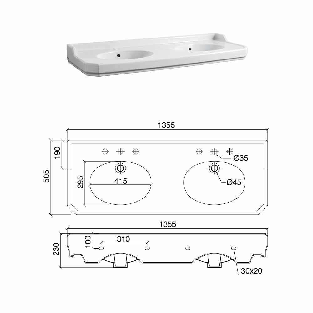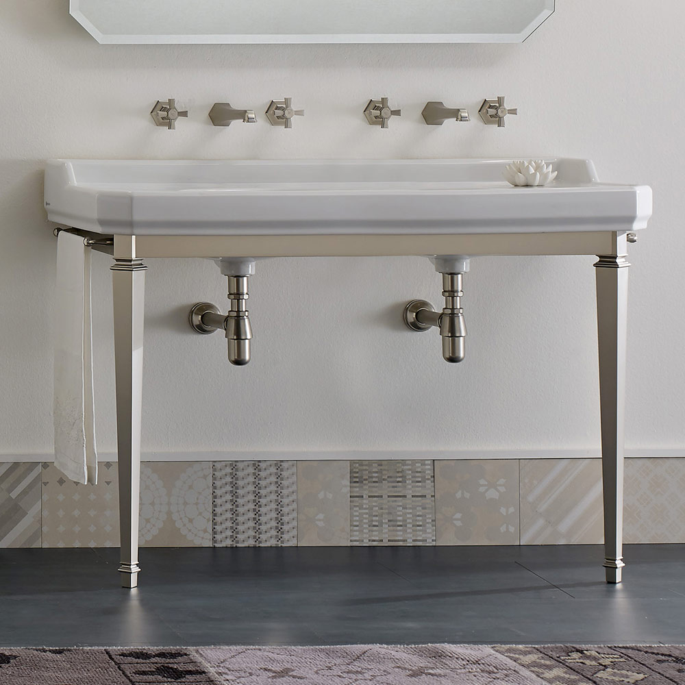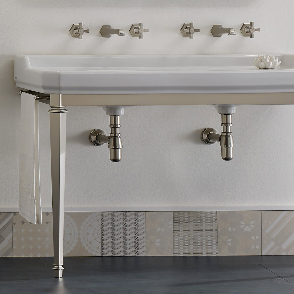 1 or 3 tap holes per basin (specify the number of tap holes required at the time of order), 1350 mm long, supported by a structure composed of metal feet in the nickel finish.