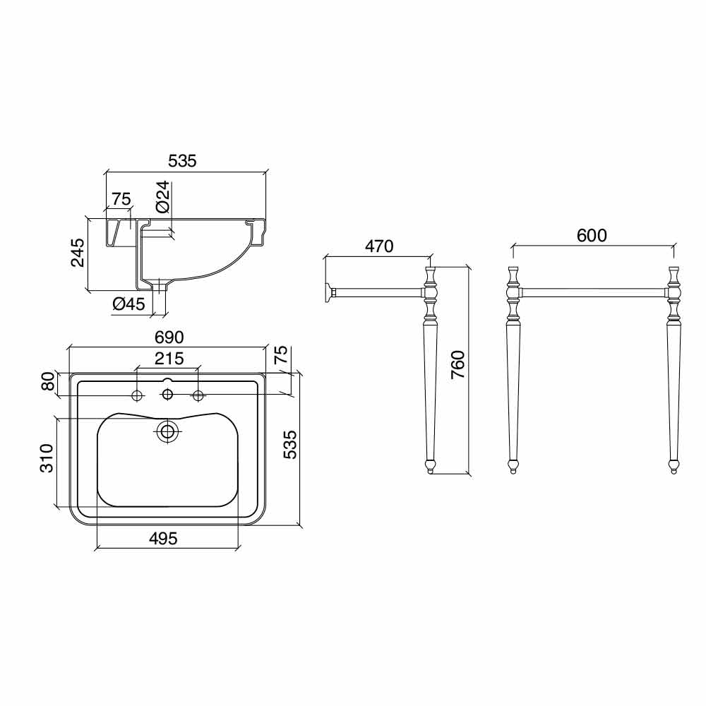 1 or 3 tap holes (specify when ordering) and is 650 mm long. The base is made of nickel finish metal.