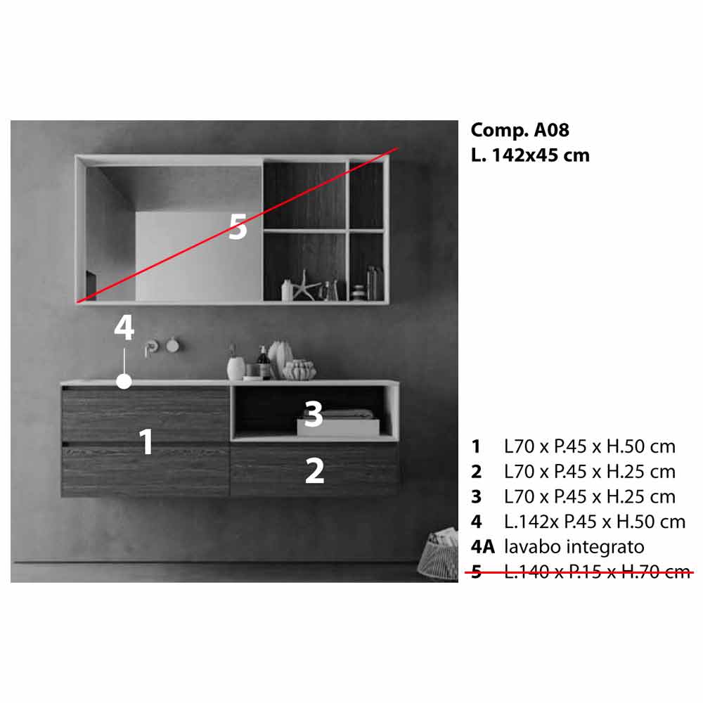 The composition includes: 1 L70 x P.45 x H.50 cm 2 L70 x D.45 x H.25 cm 3 L70 x D.45 x H.25 cm 4 L.142x P.45 x H.50 cm 4A integrated washbasin