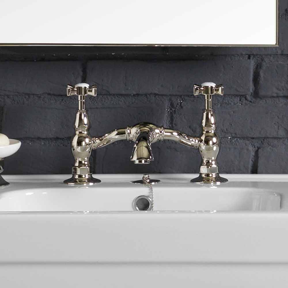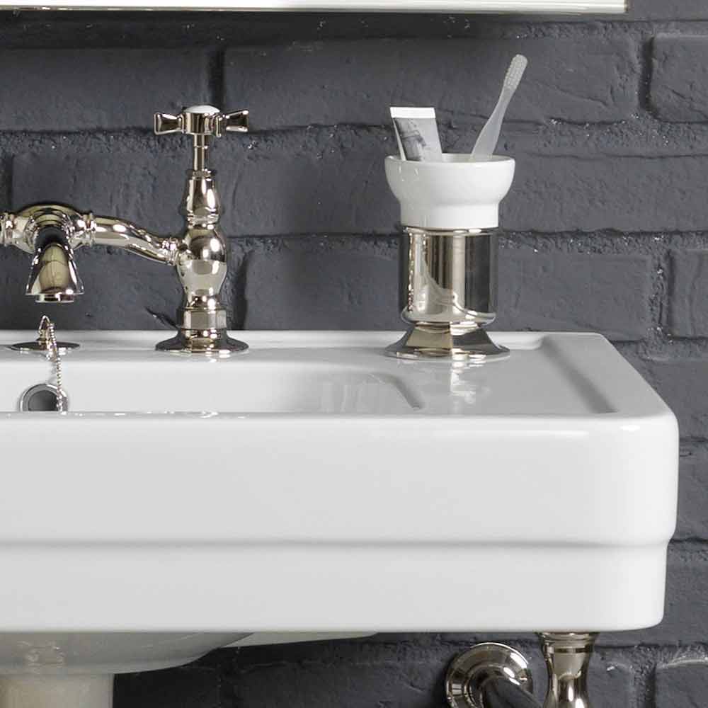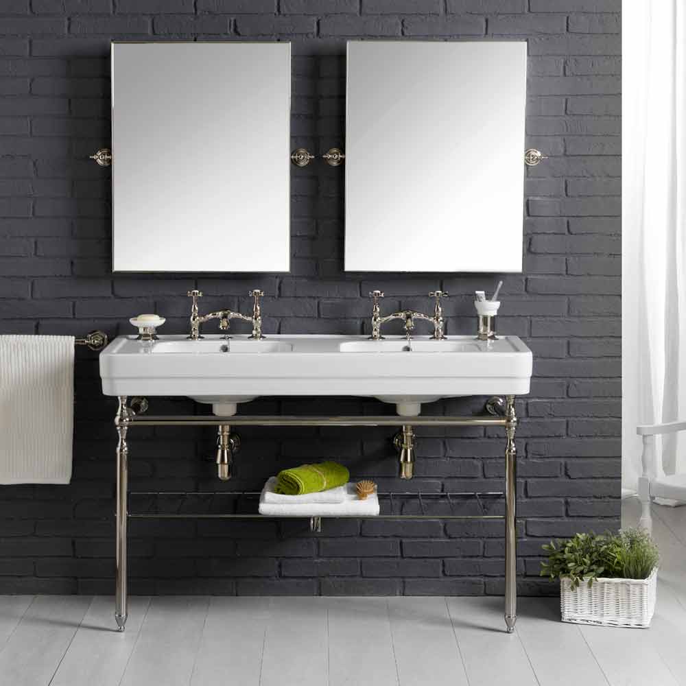 Parts included in the composition: - White ceramic washbasin. Measurements: L.130 cm x D. 51 cm - Metal base + base grid. Polished nickel finish L.130 cm x h. 76 + 13 cm x 51 cm wall overhang - 2 bridge taps together with chain - 2 siphons - 2 drains - 2 tilting rectangular mirrors with brass metal frame in polished nickel finish. Measurements: 76.5cm x 57.5cm. - Free standing toothbrush holder - Countertop ceramic soap holder