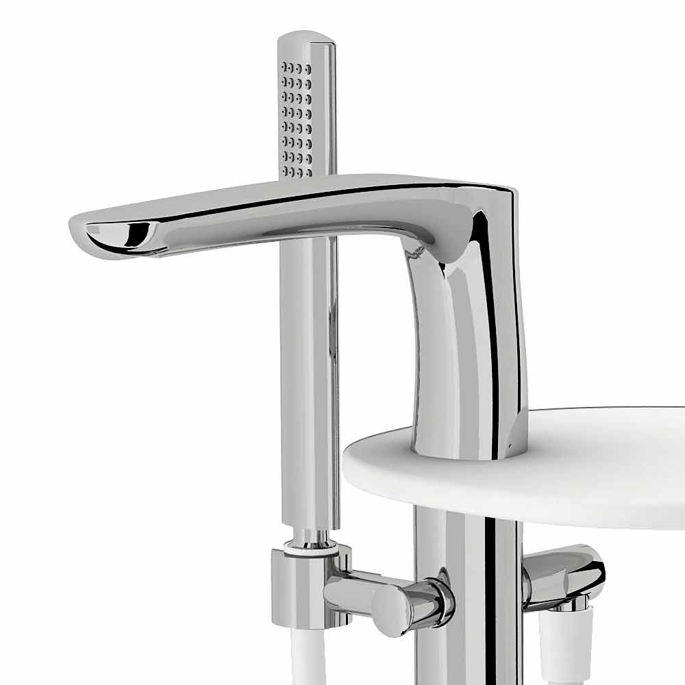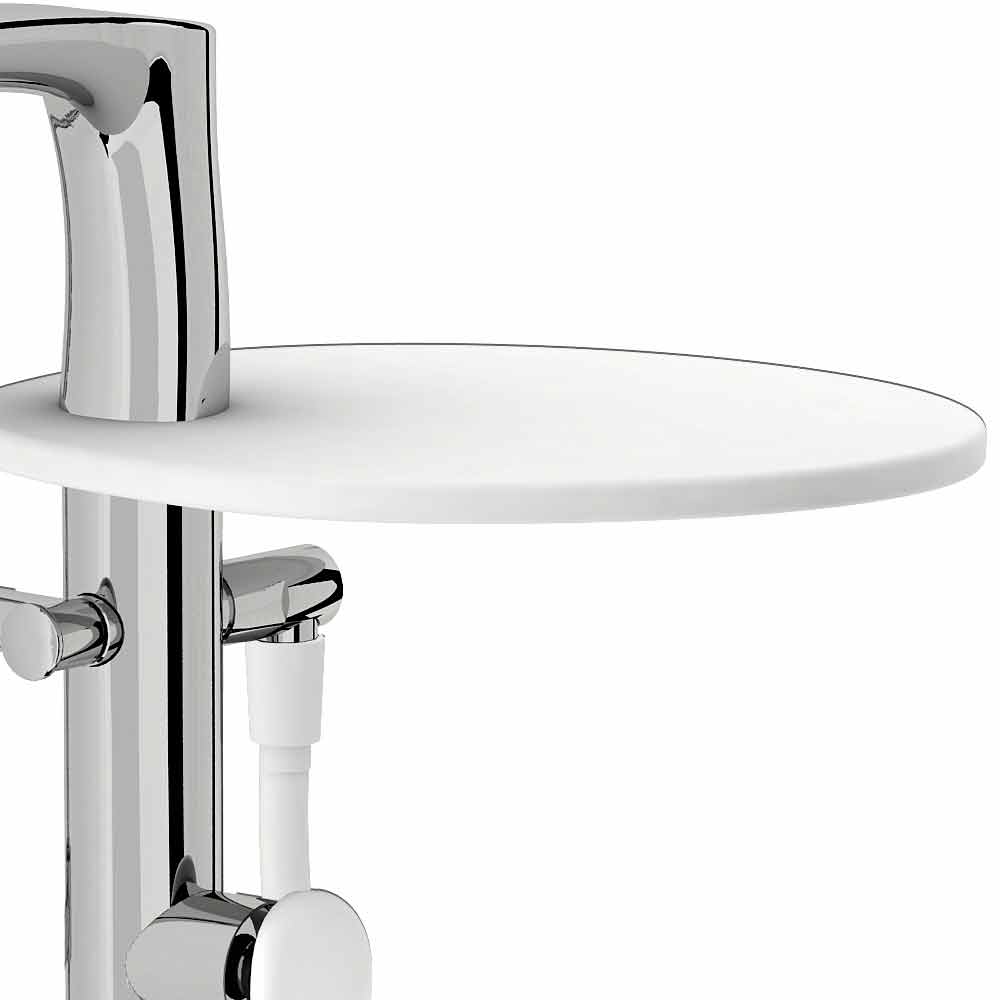 Deck mounted bath mixer with diverter, duplex hand shower and shelf in DuPont ⢠Corian® Made in Italy.