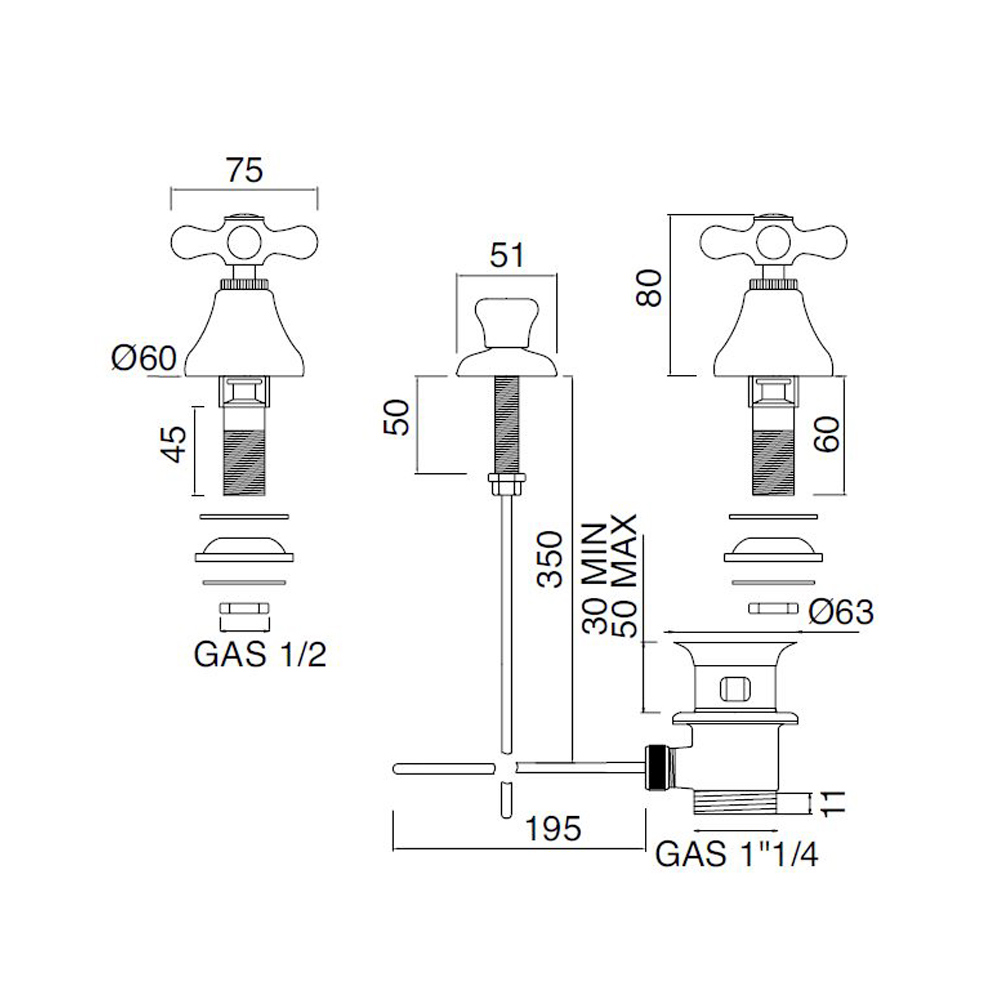Classic 3-hole bidet tap with drain and high quality internal delivery made in Italy.