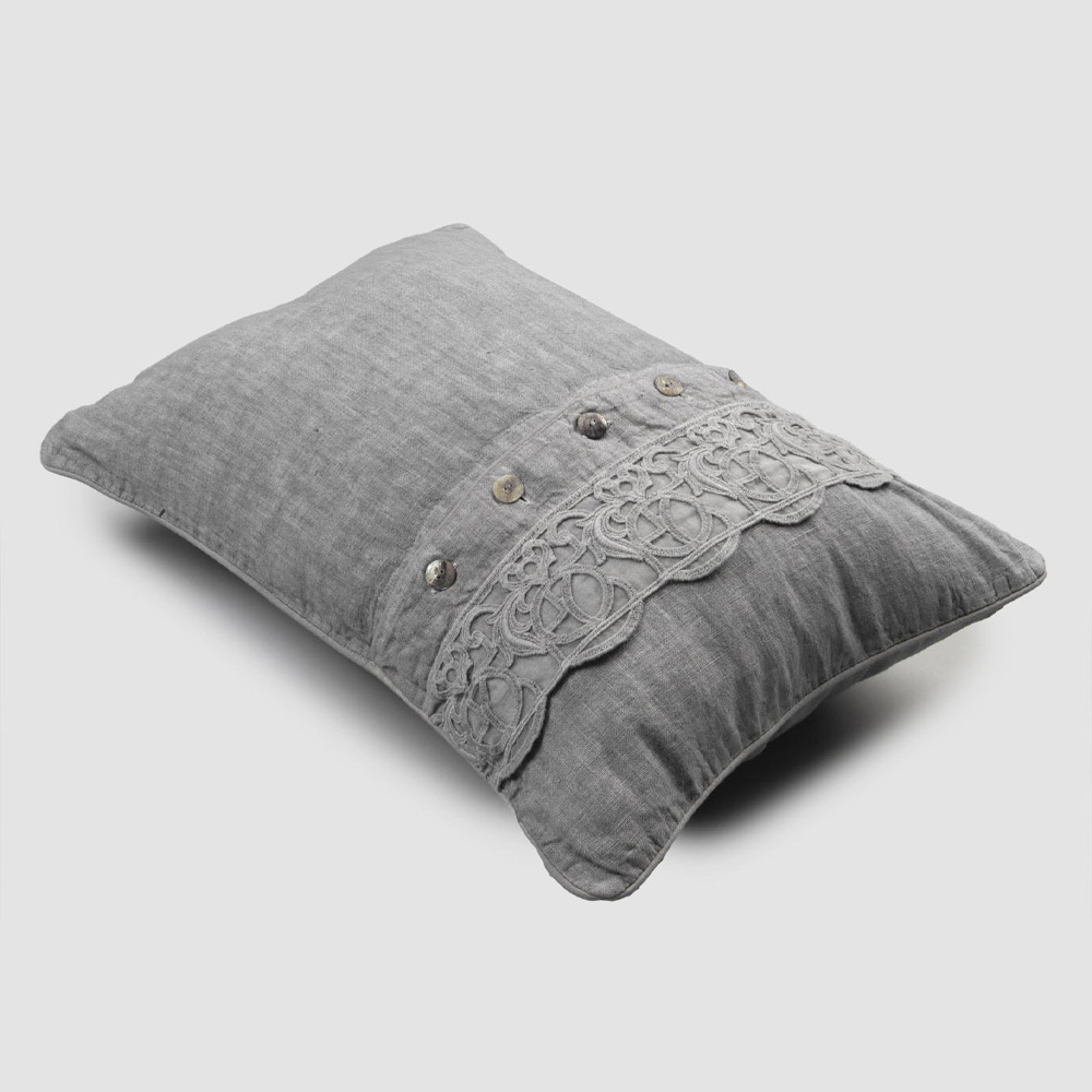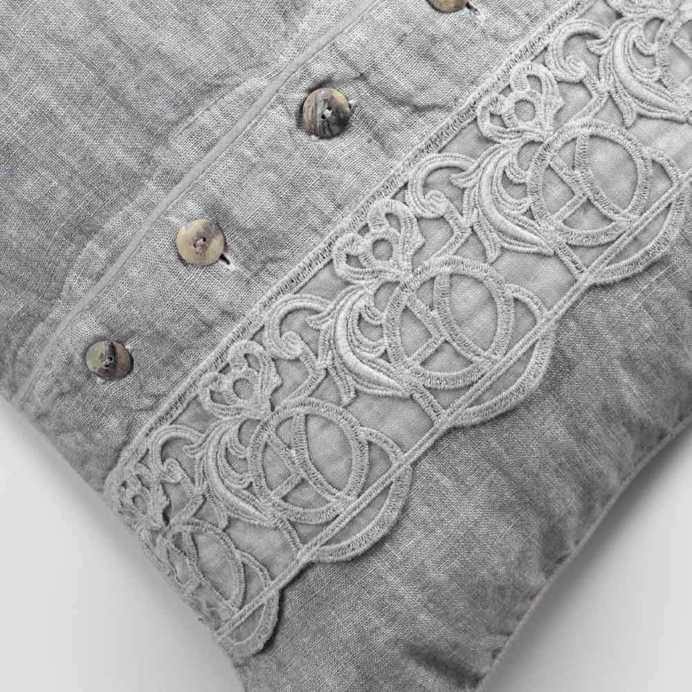 Pillowcase in gray linen with synergy lace, central buttons and piping, luxury made in Italy.