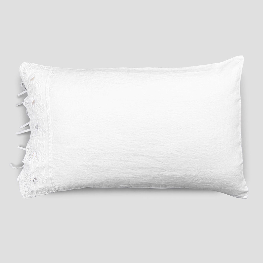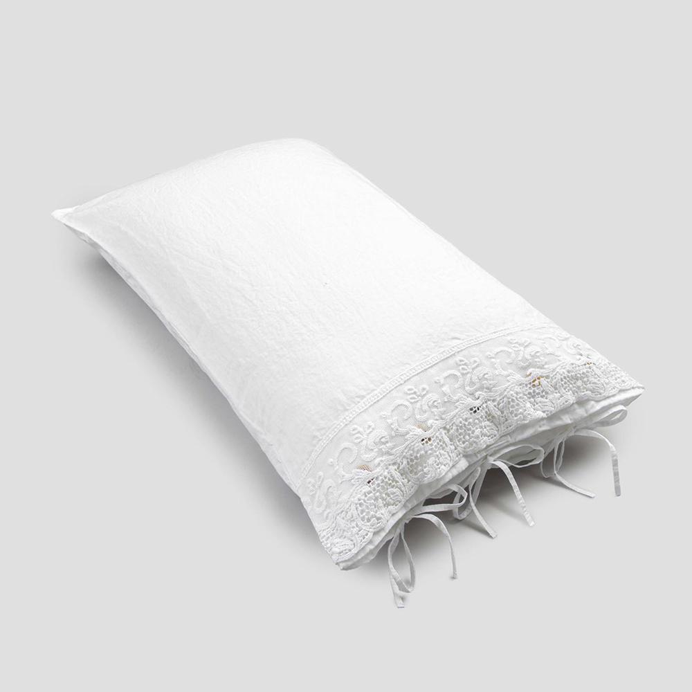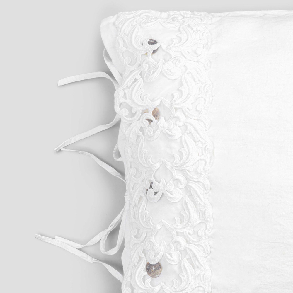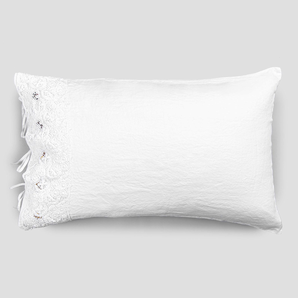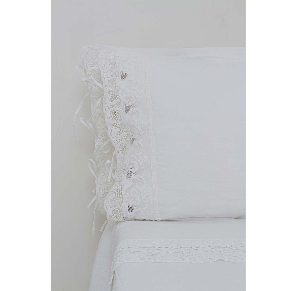Pure white linen bed pillowcase with various types of lace, buttons and laces closure, luxury handmade design made in Italy.