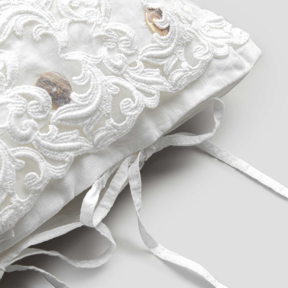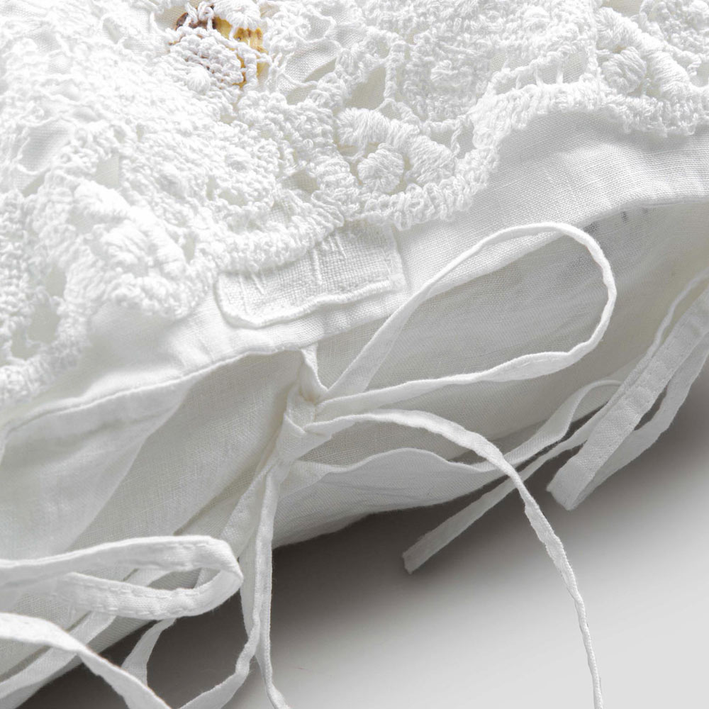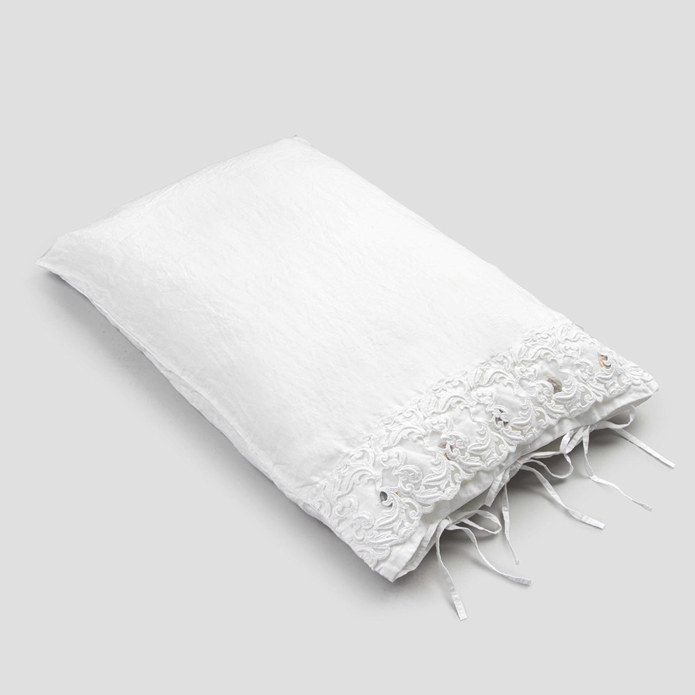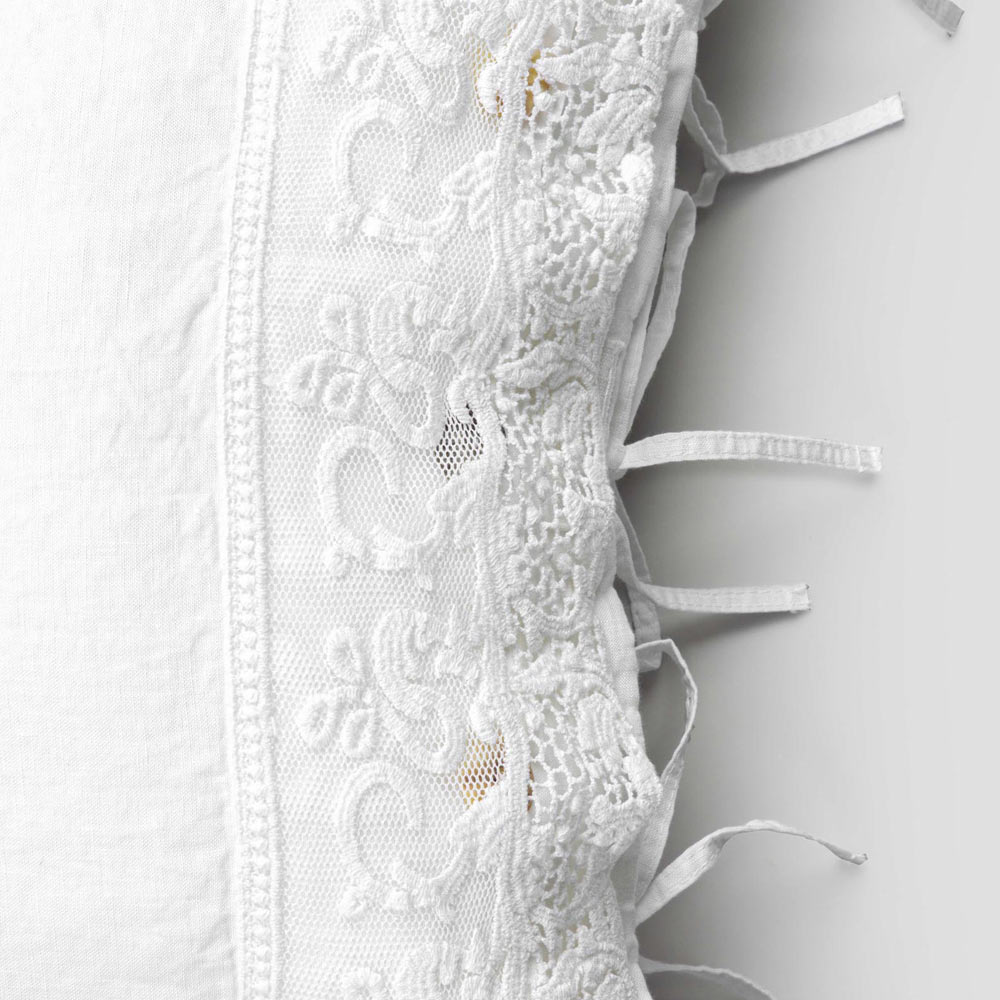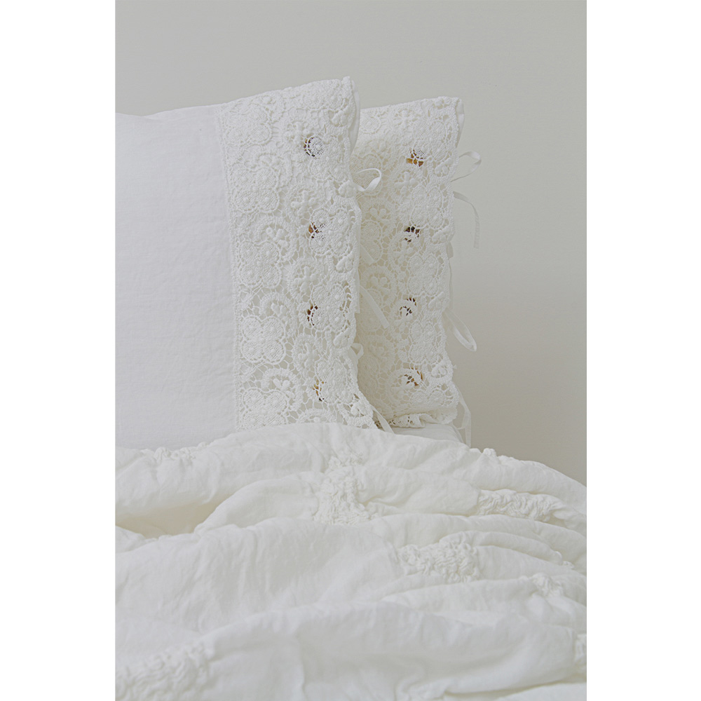 Pure white linen bed pillowcase with various types of lace, buttons and laces closure, luxury handmade design made in Italy.