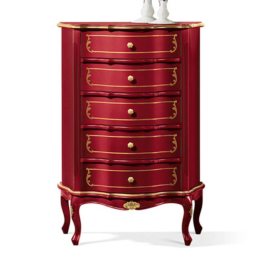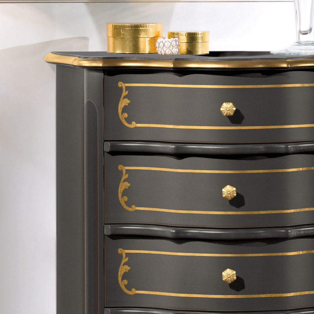 Classic style bedroom chest of drawers with 5 drawers made of wood . Ideal to give elegance to any environment in which it is placed, this chest of drawers is available in four different finishes to better adapt to every furnishing need. A unique and refined complement, completely made in Italy by skilled master craftsmen , masters of art who finish each complement with wisdom and taste for elegance. The production is carried out using fine materials , and performing the workbyhand with the utmost care and professionalism that distinguishes Made in Italy products.
