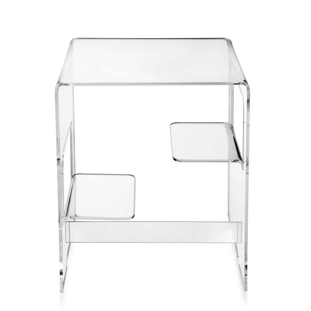 The transparencies and essential lines that distinguish it, determine a practical and modern design thanks to the two shelves that can be used as object holders.